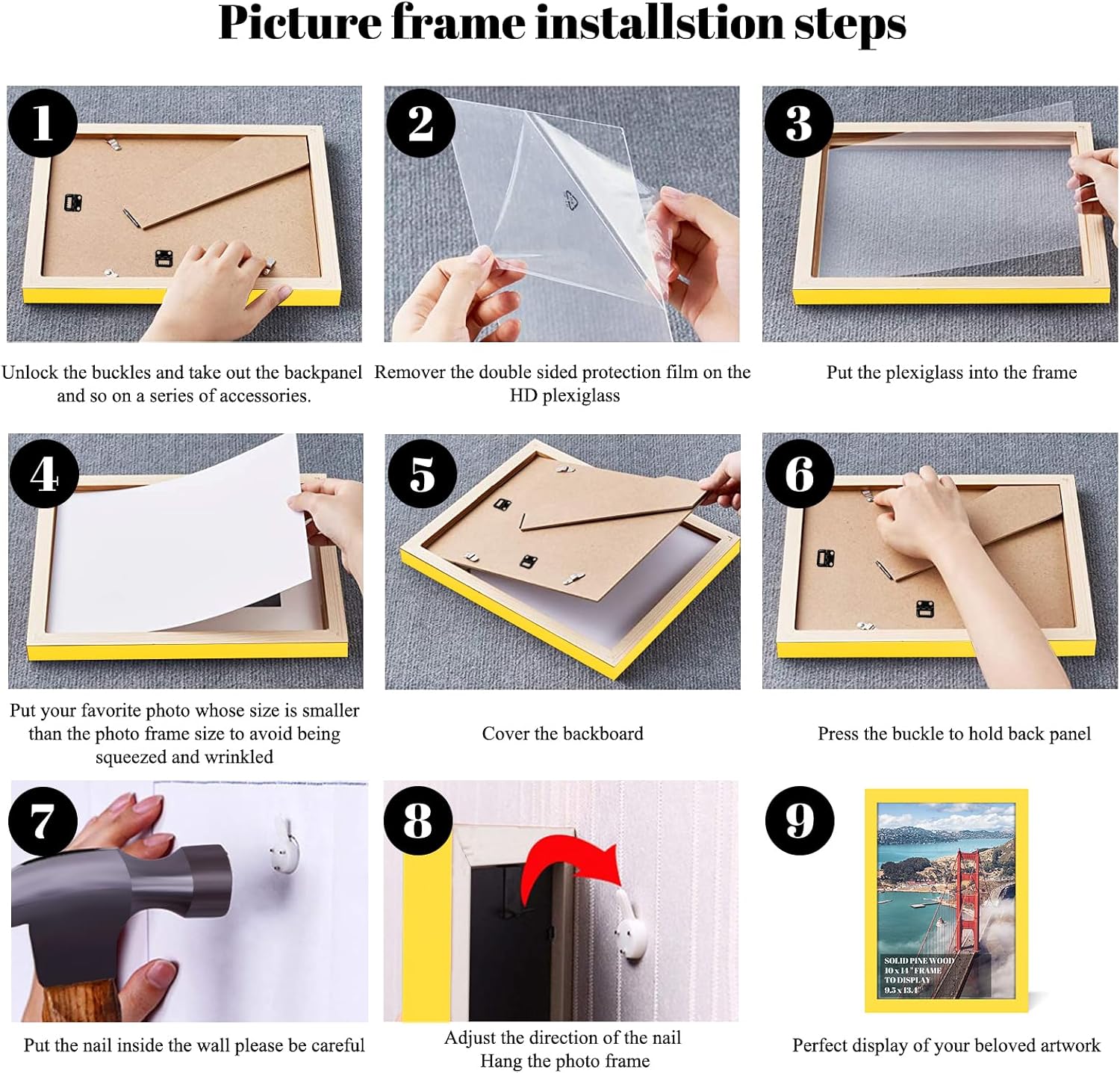 - 『Important Noted』Please Make Sure Tear Off Both Side Film On The Font Of Transparent Protective Sheet(Cover) ; Pin-Hook Included. Can Hang the Frames on the Wall of Living Room&Baby Room&Stair Case