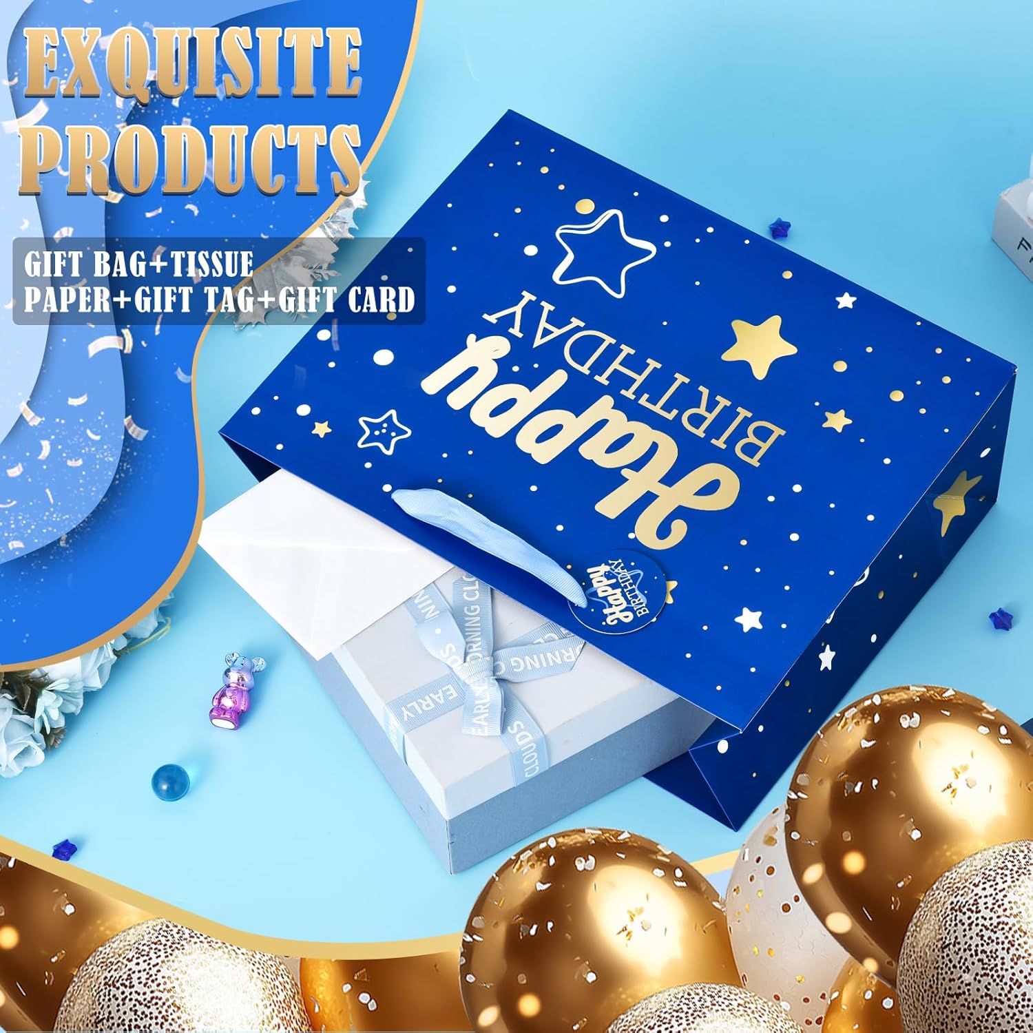 13" Blue Happy Birthday Gift Bag with Tissue Paper and Greeting Card for Party,Happy Birthday Gift Bag for Men Women,Gift Bags Medium size(1 PCS Blue Hot Stamping)