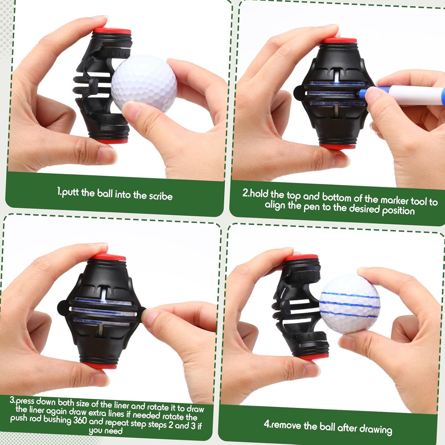 - Easy to Use for Quick Marking: the golf ball line marker tool can rotate 360°, and you can draw all 180°-360° lines on the golf ball; Both the front and back can be marked; 3 lines provide accurate directional guidance, really nice for aiming; It is designed for golf line alignment, easy to draw lines to check the alignment of your swing putter; Which is very helpful to improve your putting skills