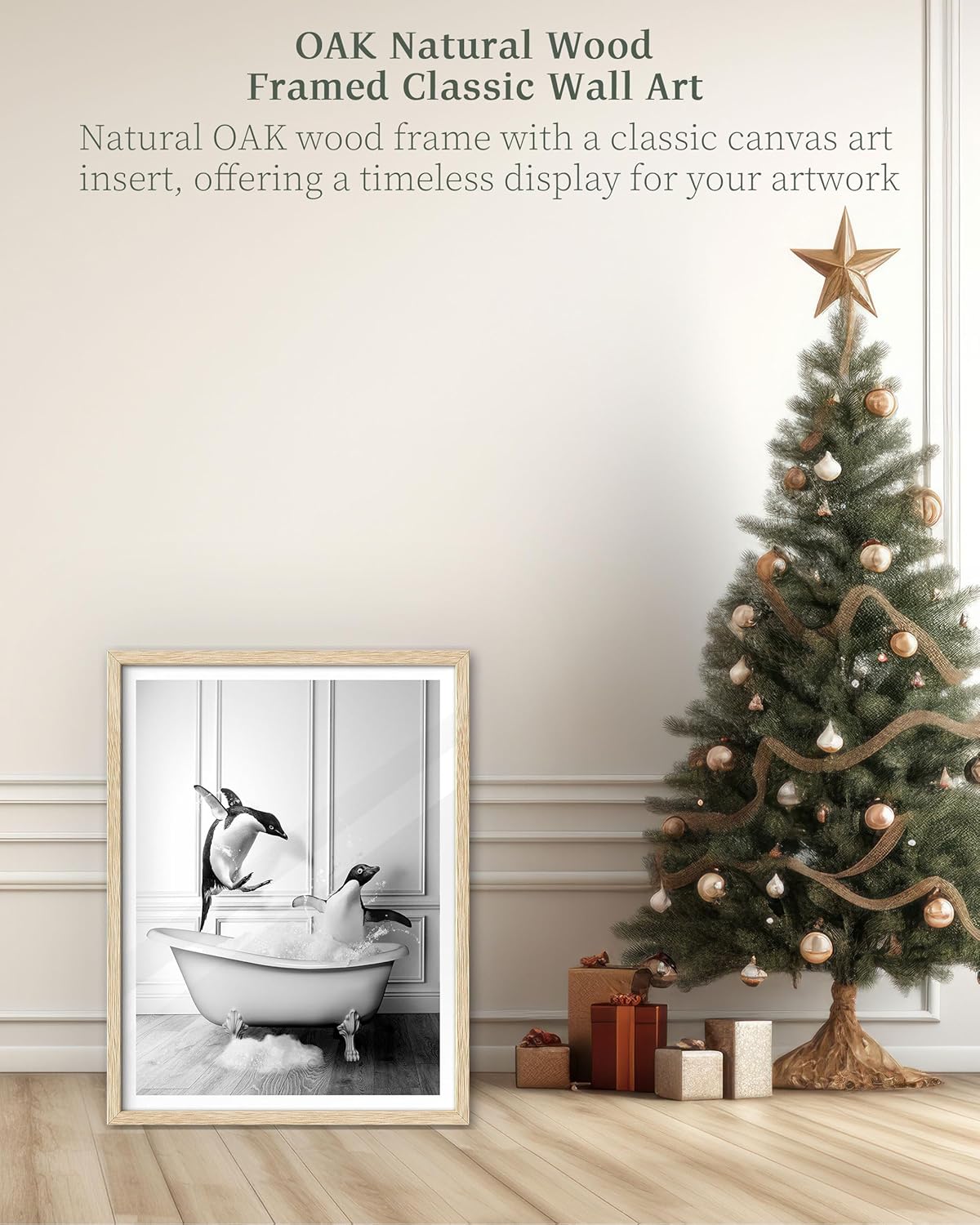 iHery Natural OAK Wood Framed Wall Art, 12x16 in Funny Bathroom Wall Art Decor, Penguin Bathing Animals Canvas Prints, Black and White Wall Decor Pictures For Bedroom Living Room Set of 1