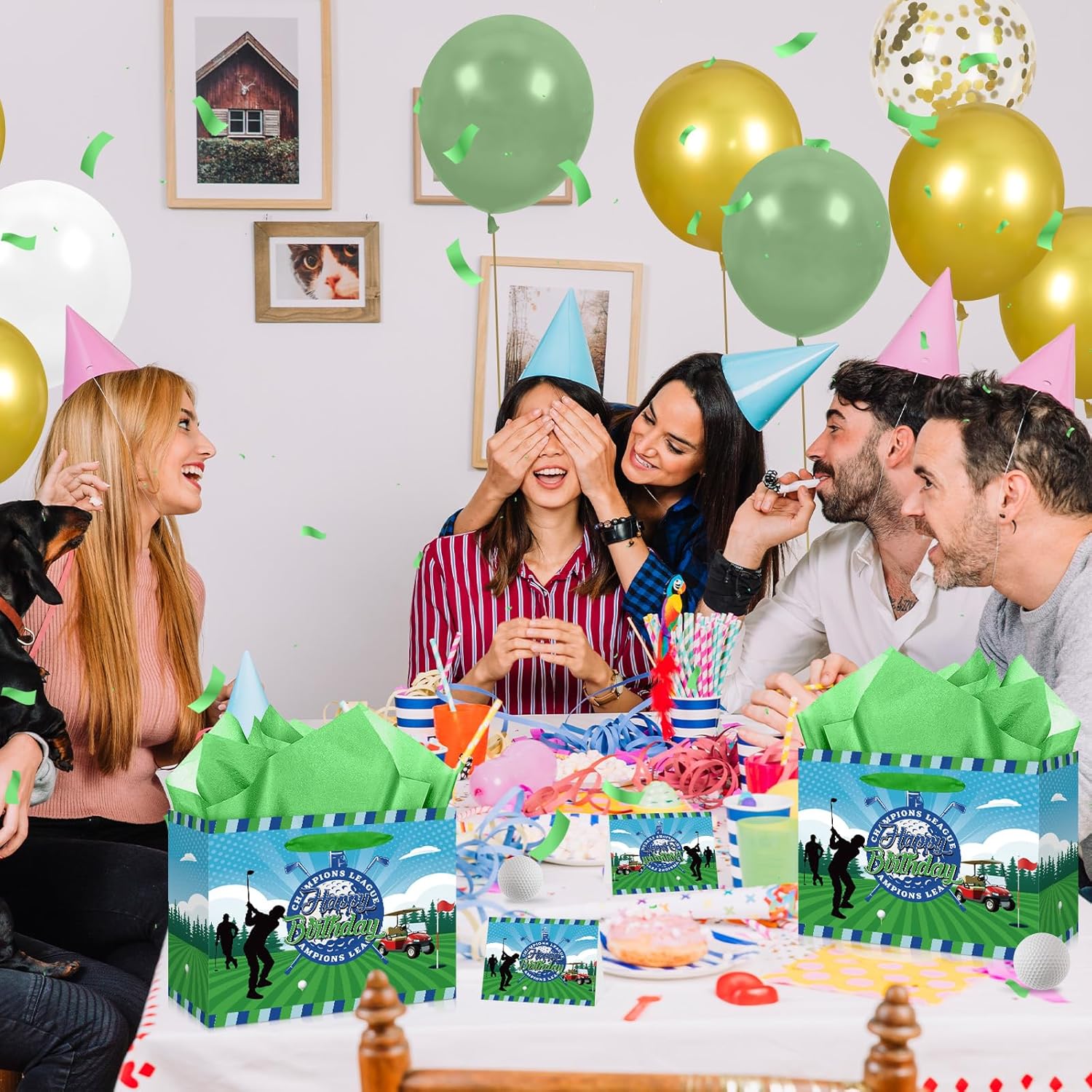 Innovoscape Golf Party Gift Bag Happy Birthday Wrapping Bag with Greeting Card and Tissue Green Birthday Paper Bag for Boys Girls Golf Party Decorations Baby Shower Bday Golf Theme Party Supplies