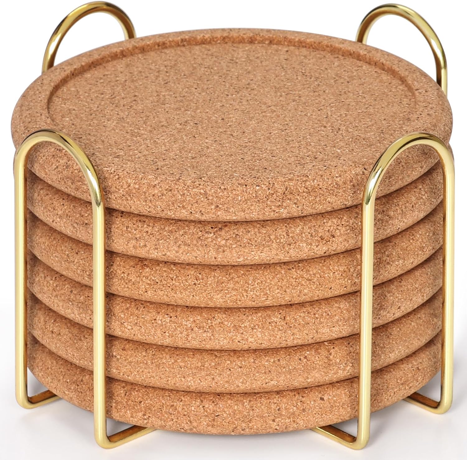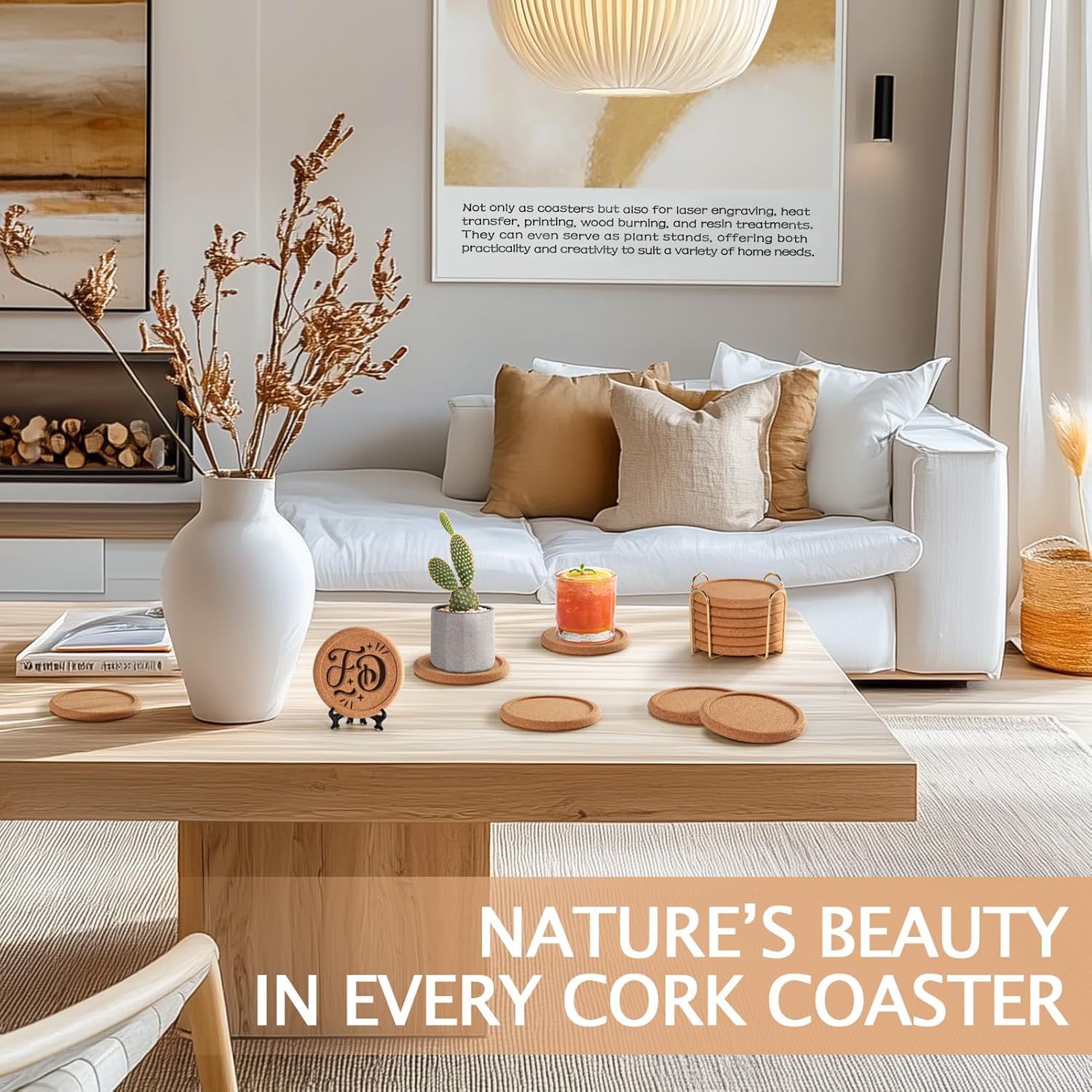 Cork Coasters for Drinks with Metal Holder, GOH DODD Absorbent Blank Coasters Tabletop Protection Home Decor for Housewarming Gifts Wedding Laser Engraving Wood Burning, Set of 6, Round, 4 Inch