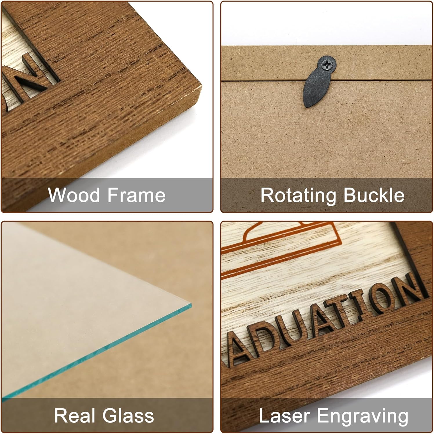 - 【High Materials】Constructed of durable MDF frame, a natural wooden cardboard, and real glass cover for long-lasting and safe display of graduation photos. Also comes with a black solid metal easel stand and hemp rope for wall hanging.