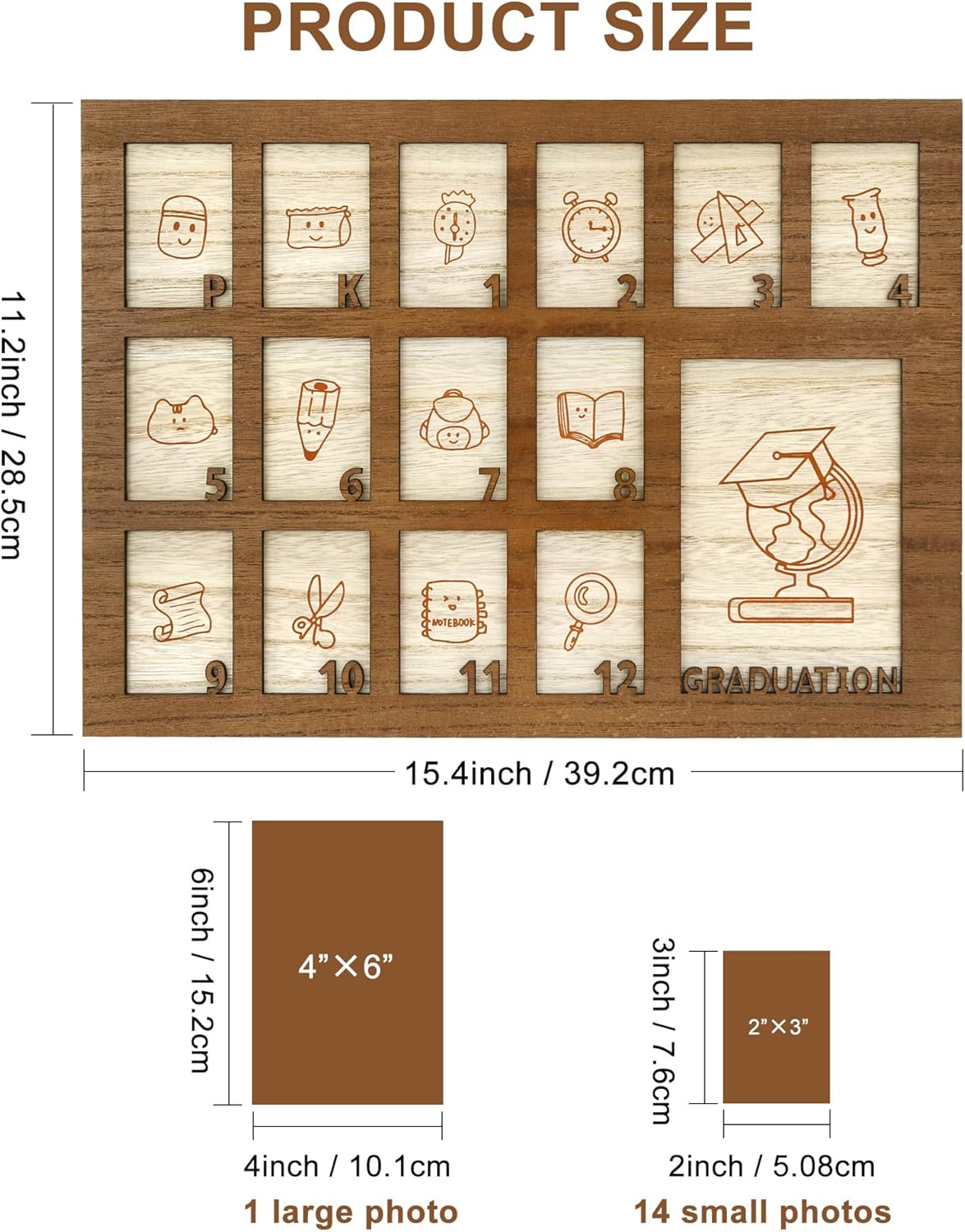 - 【Frame Size】11.2" H x 15.4" W wooden frame , Photo inserts: 6" H x 4" W (1 large graduation photo), 3" H x 2" W (14 school photos). You can fill with 15 photos of your growing child from preschool to university!