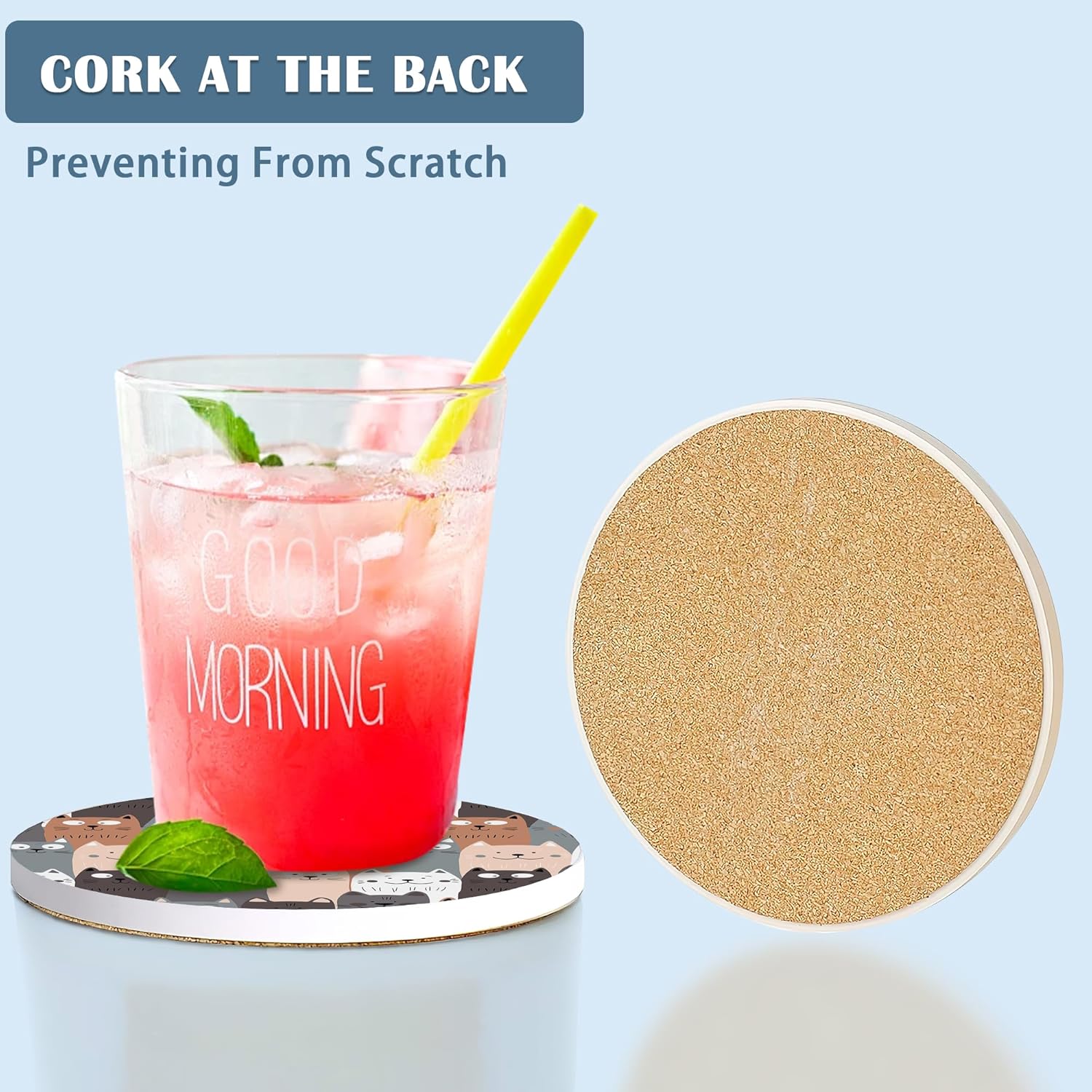 - Non-slip Bottom:Our absorbent coasters come with a soft cork backing design that prevents scratches and marks on your furniture,while also providing a secure grip on any surface