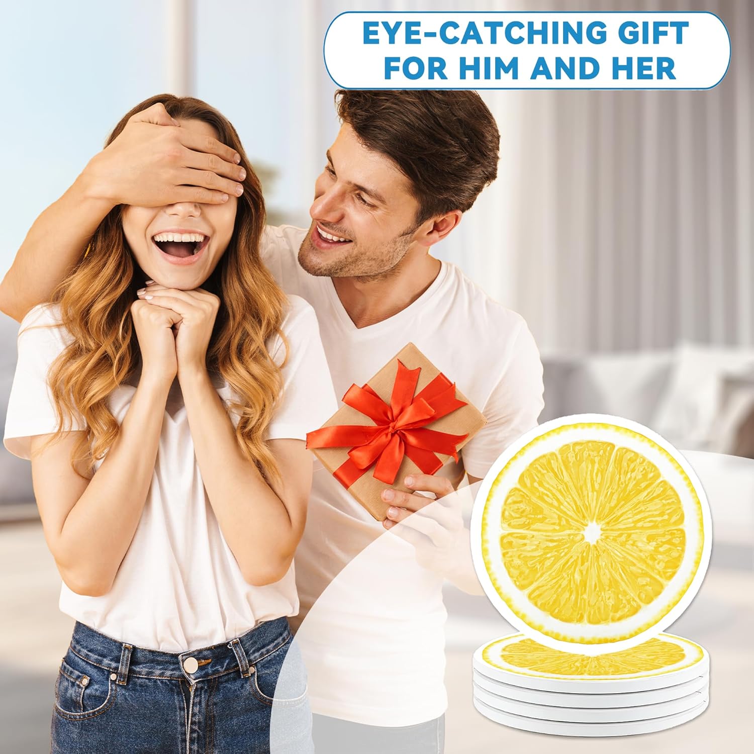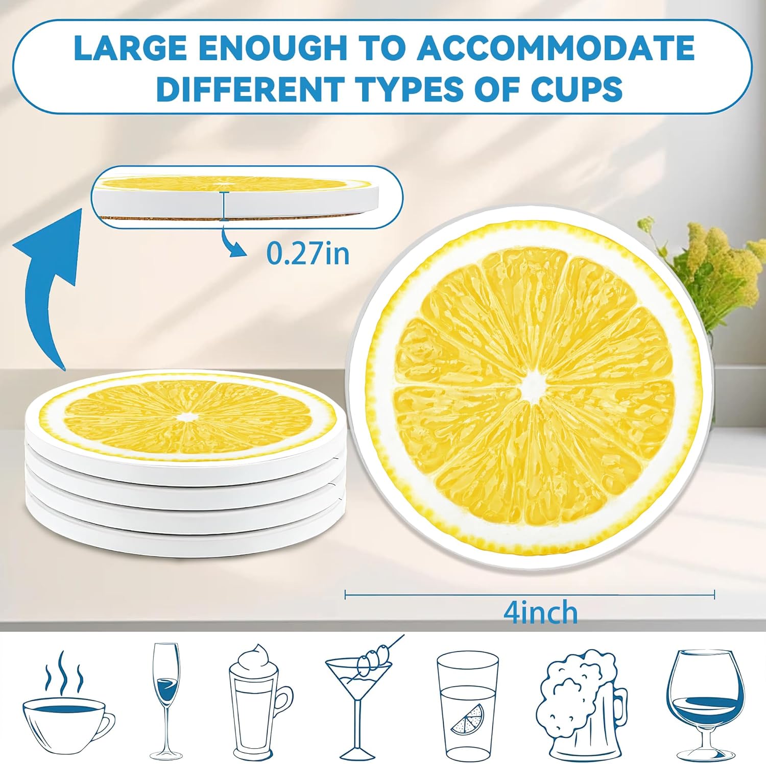 Drinks Coasters Set of 4, Lemonade Round 4" Cup Coasters, Absorbent Ceramic Stone Coasters with Cork Base, Cute Coasters for Table Home Décor, Ideal Gifts for Women Men