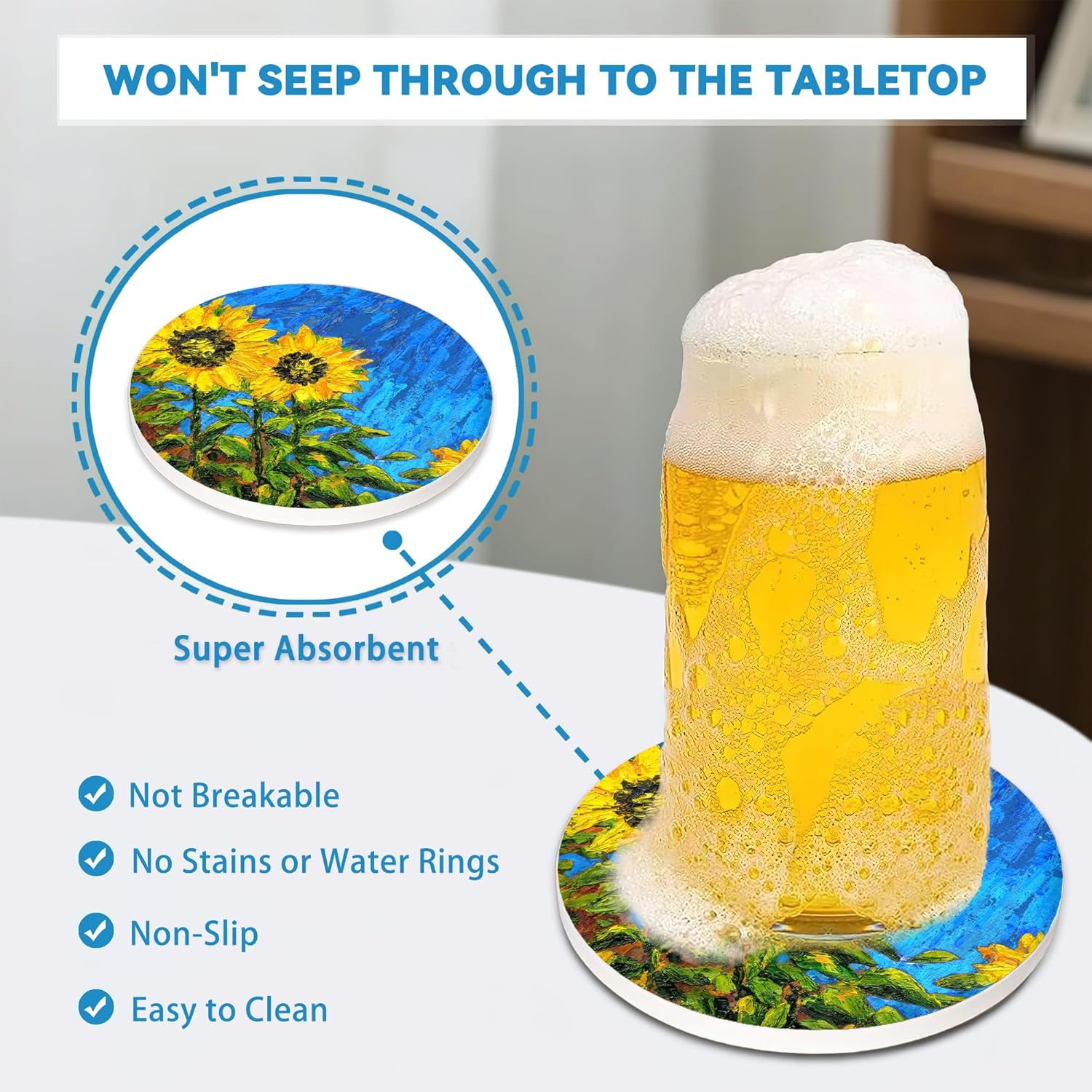 Drinks Coasters Set of 4, Sunflower Oil Painting Round 4" Cup Coasters, Absorbent Ceramic Stone Coasters with Cork Base, Cute Coasters for Table Home Décor, Ideal Gifts for Women Men