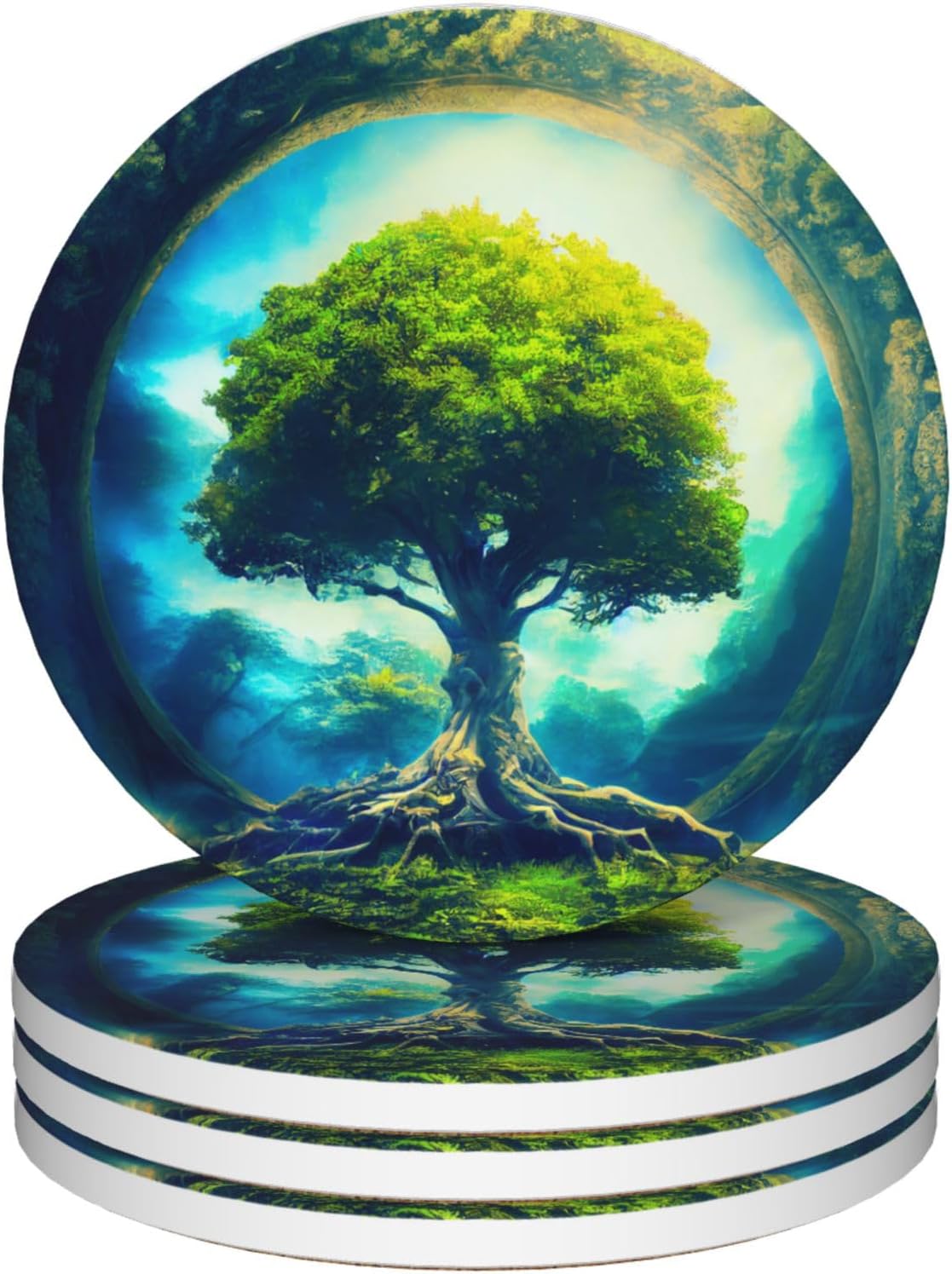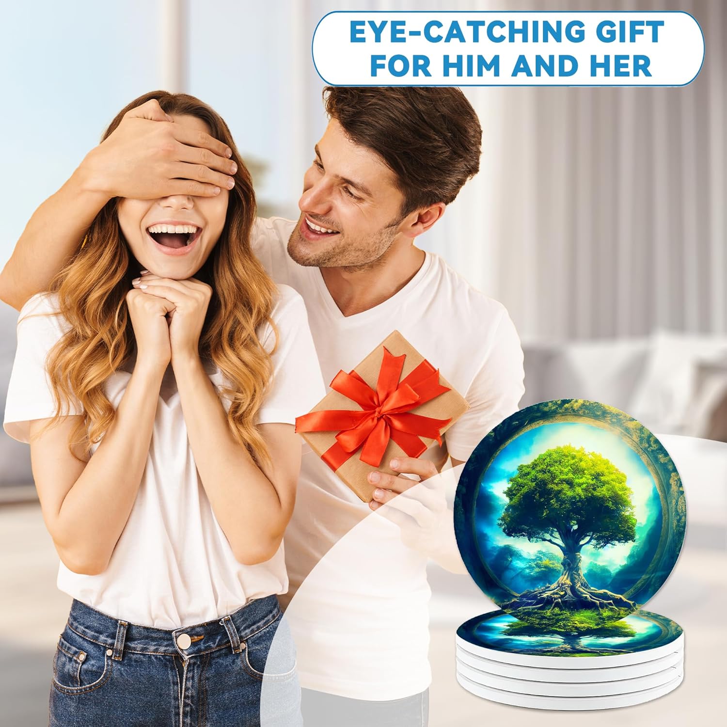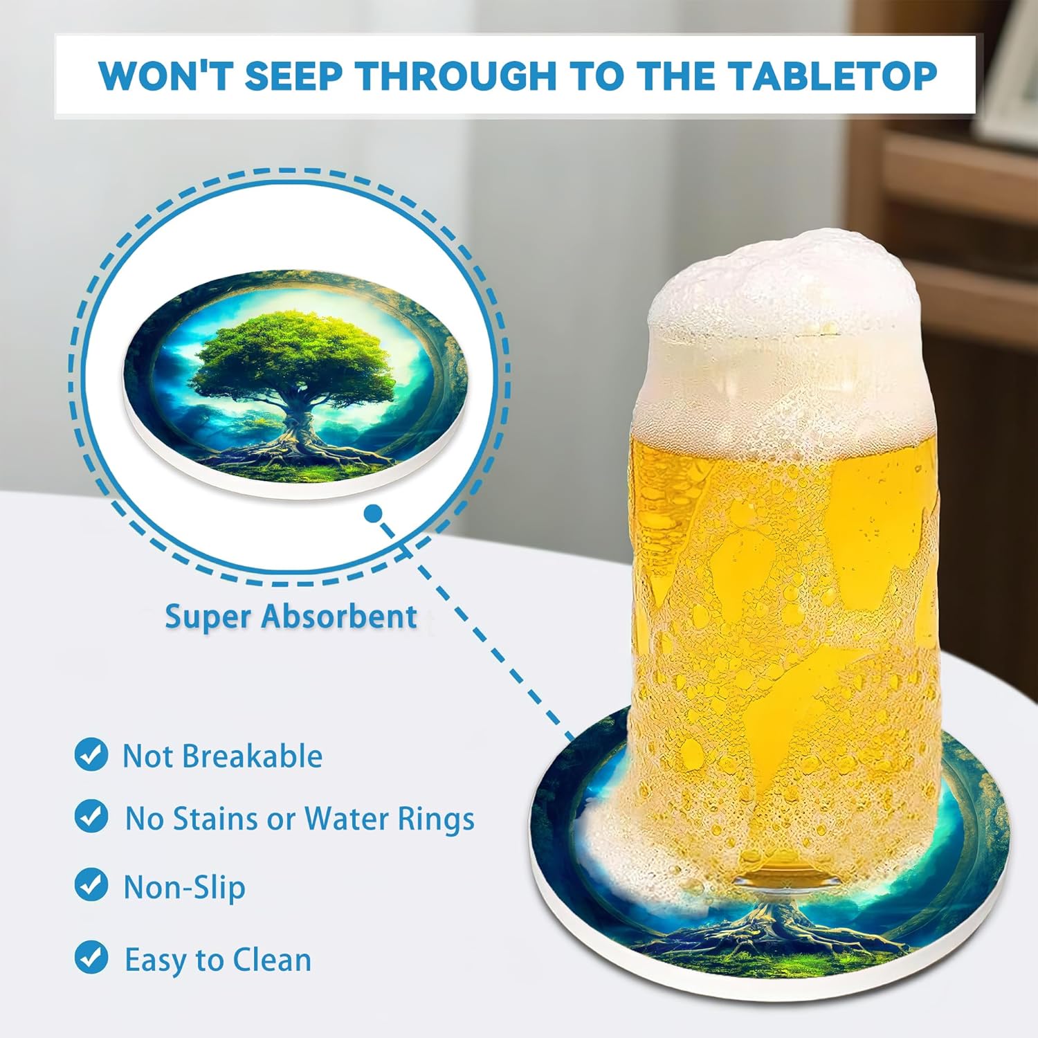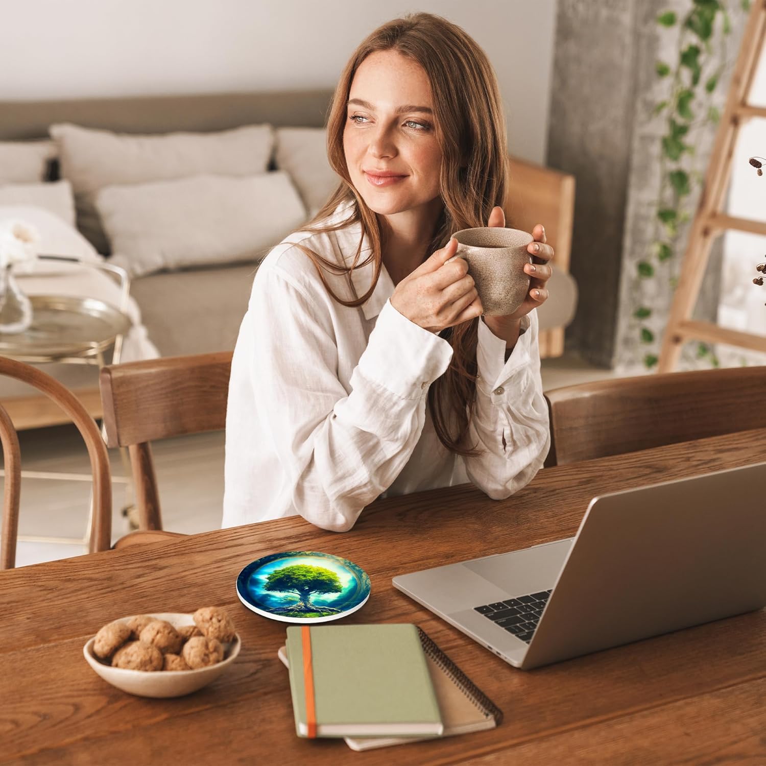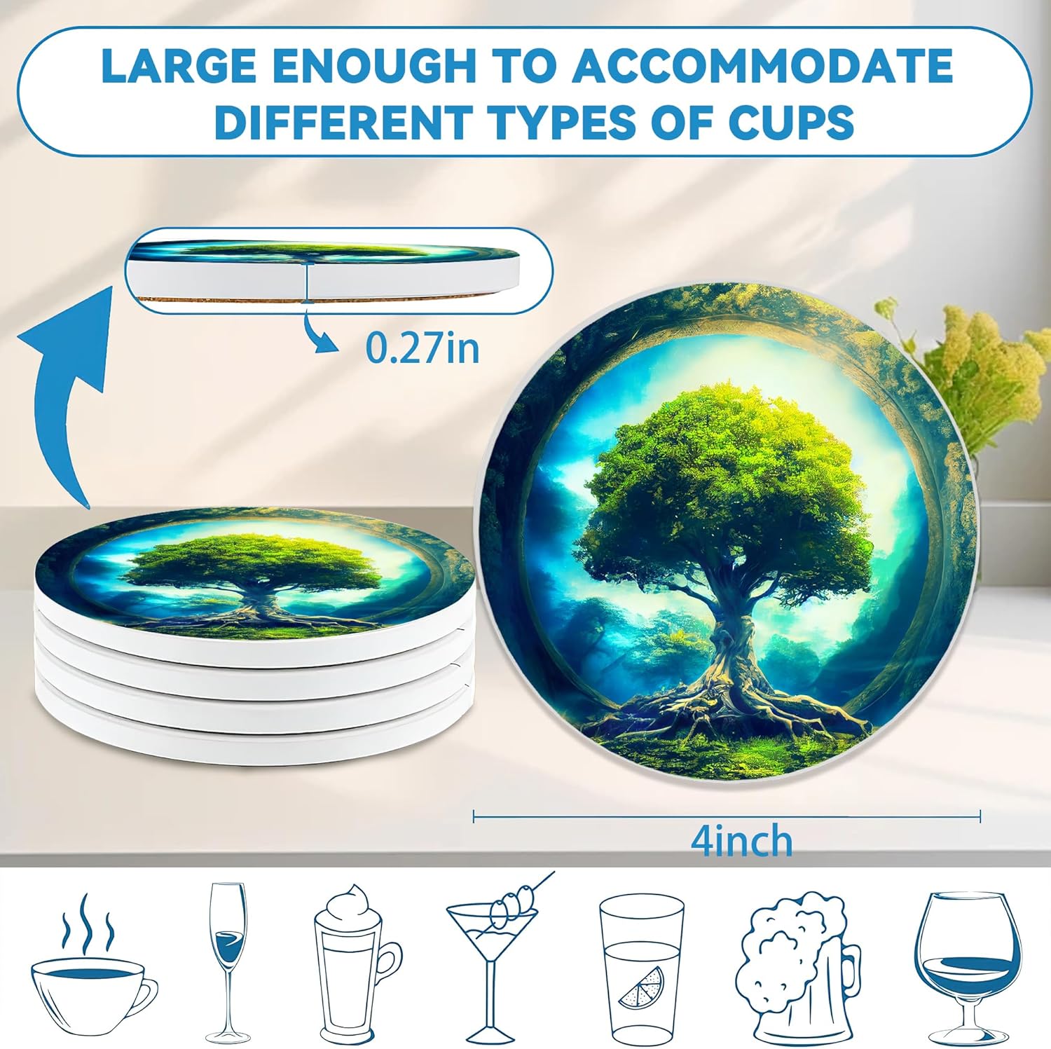Coasters Set of 4, Magic Green Round 4" Ceramic & Cork Coasters, Absorbent, Ideal for Table Home Decor & Gifts
