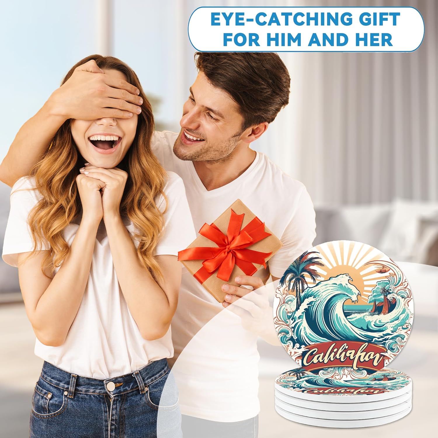 Drinks Coasters Set of 4, California Beach Round 4" Cup Coasters, Absorbent Ceramic Stone Coasters with Cork Base, Cute Coasters for Table Home Décor, Ideal Gifts for Women Men