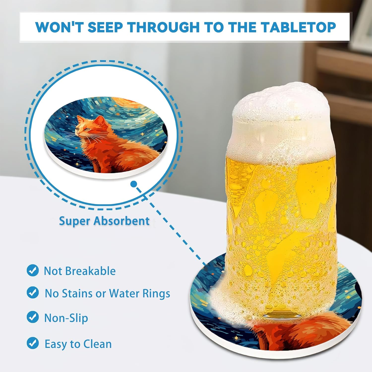 Starry Night Cat Coasters Set of 4, Round 4" Absorbent Ceramic Stone Coasters with Cork Base, Cute Table Home Decor, Ideal Gifts for Women Men