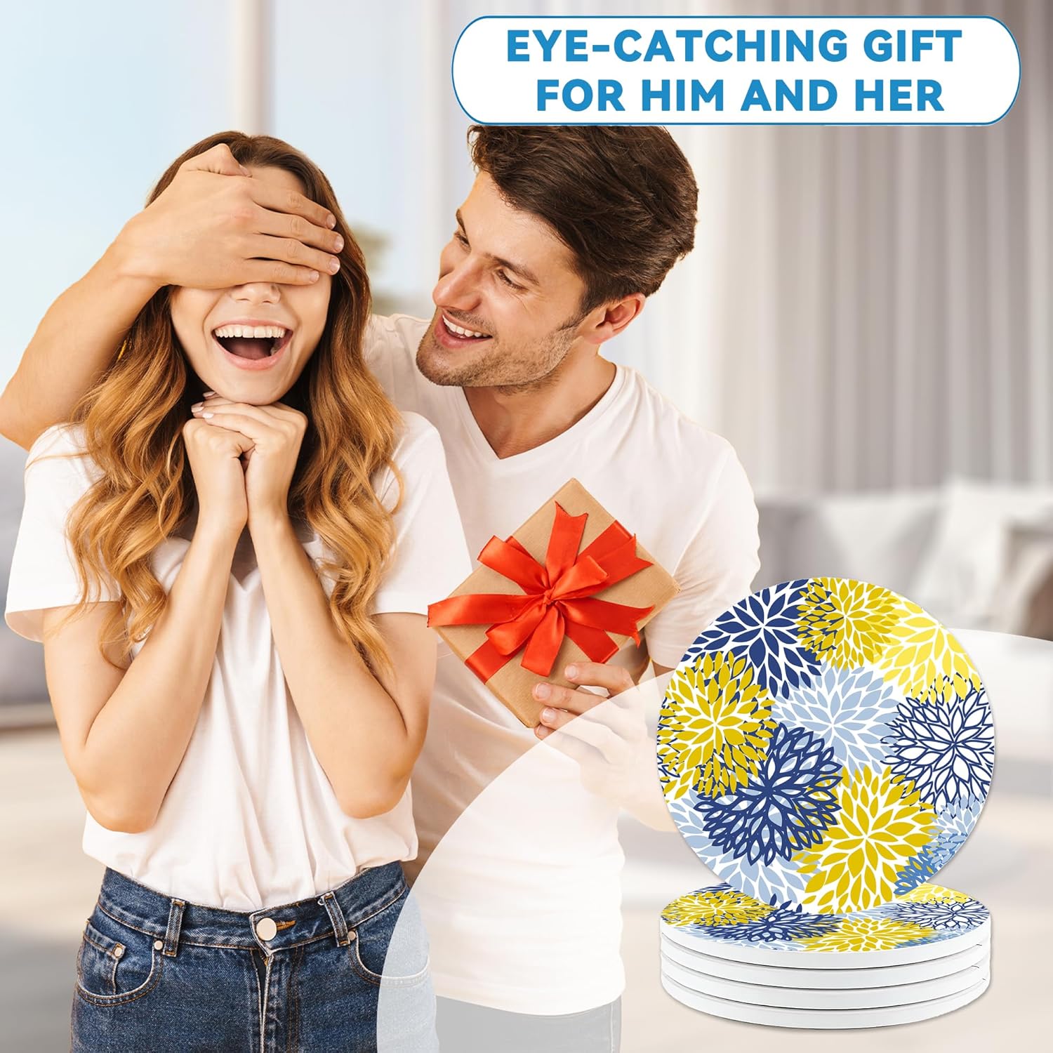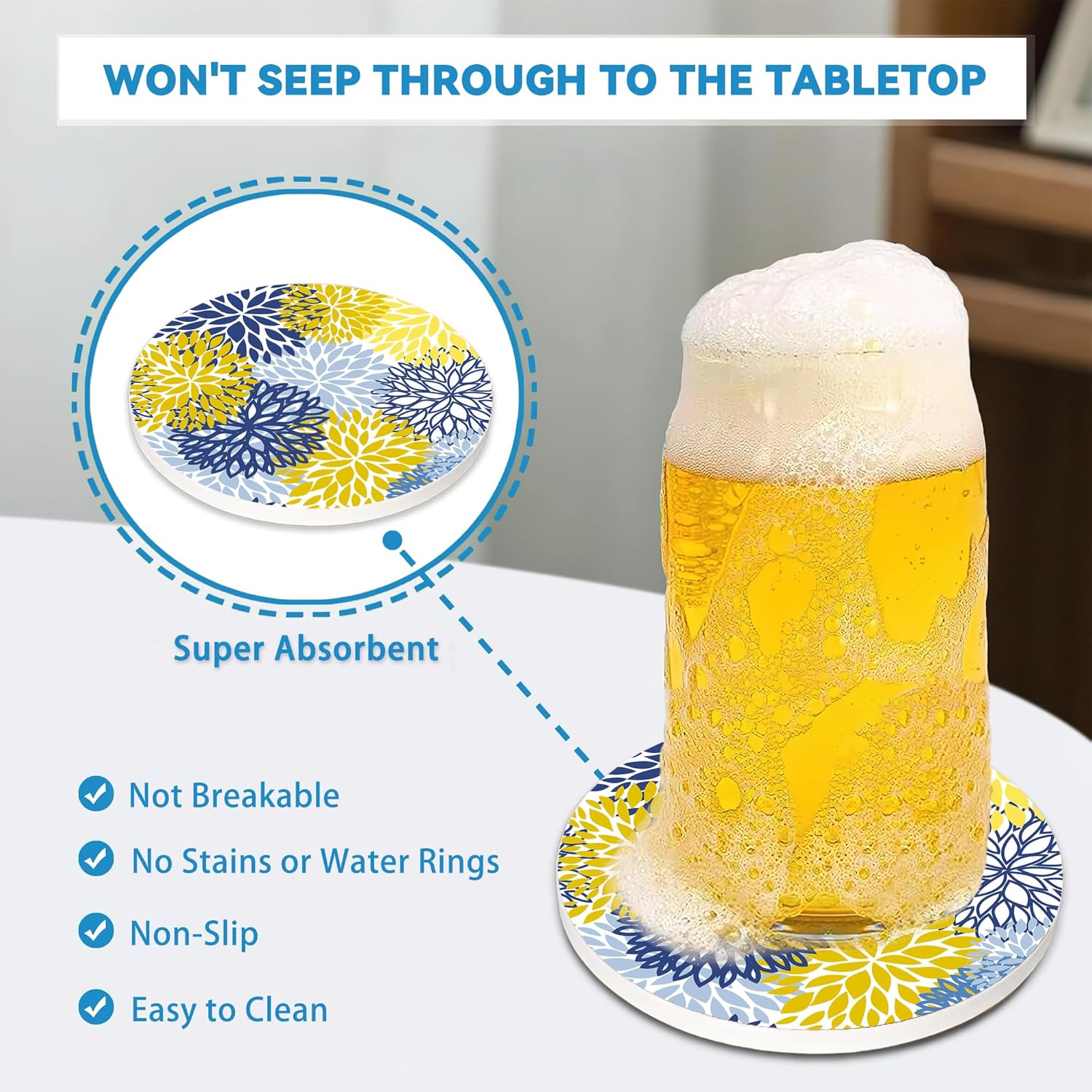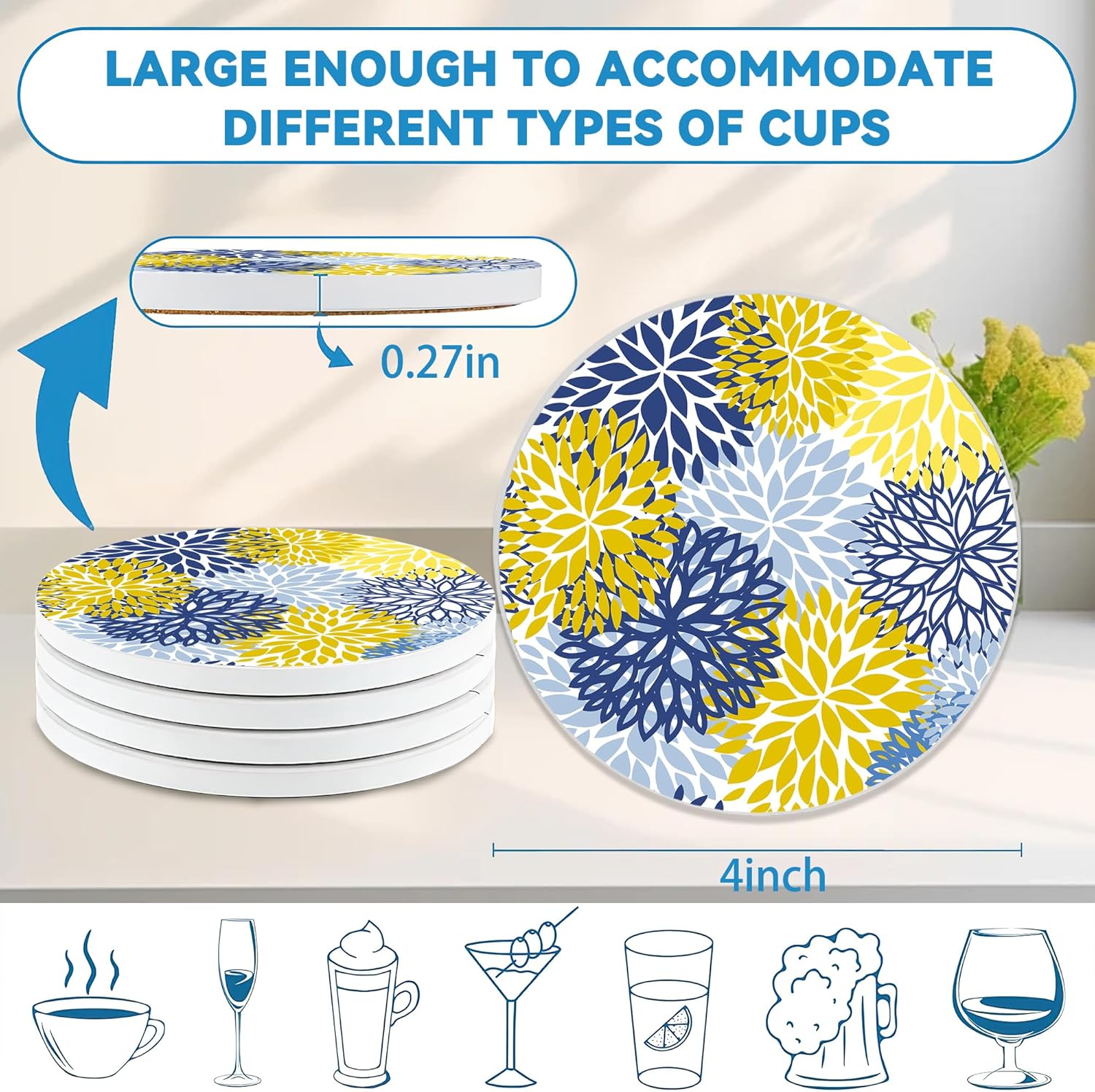Spring Drinks Coasters Set of 4, Absorbent Cup Mat with Cork Base,Ceramic Stone for Table Home Decor 4" Navy Blue Flower