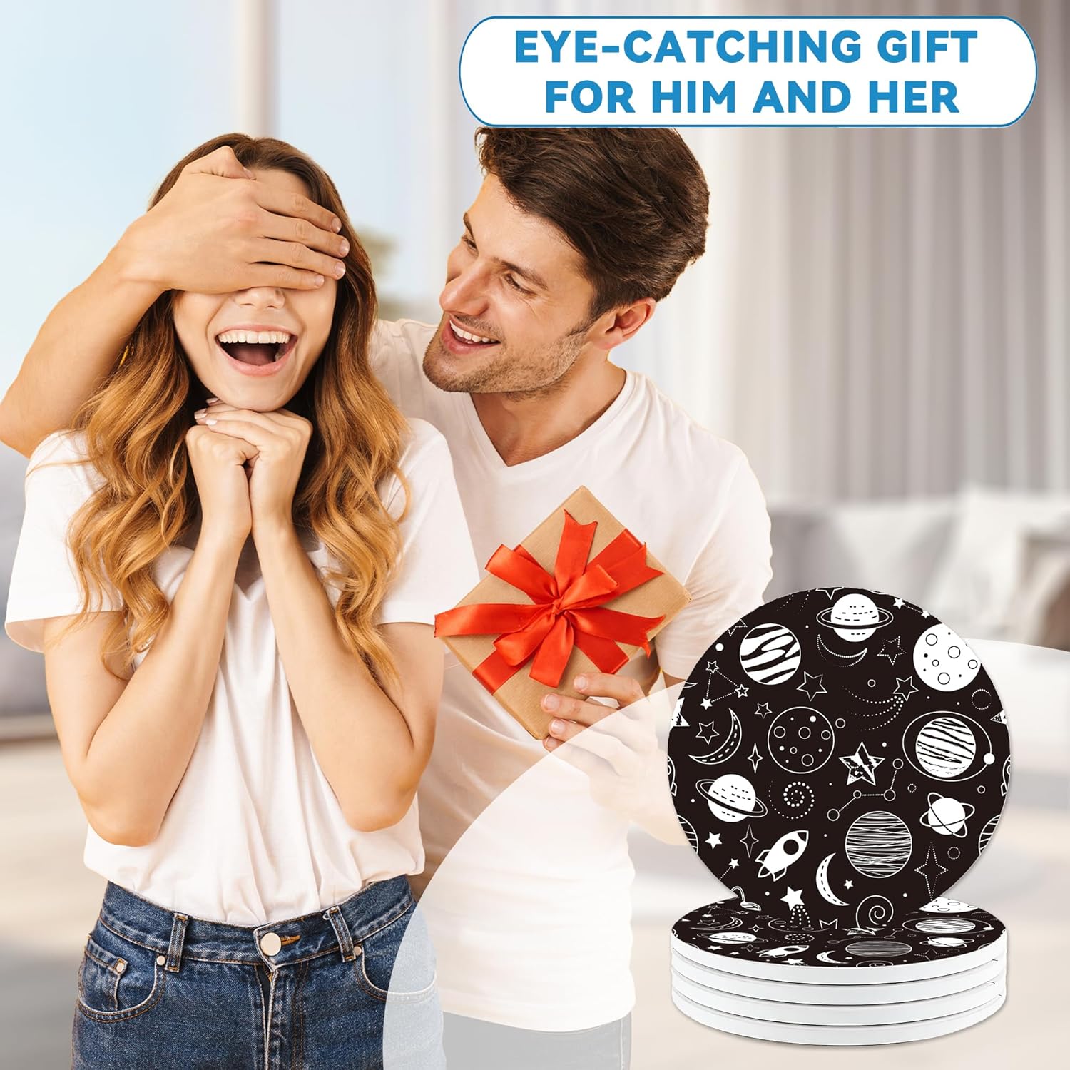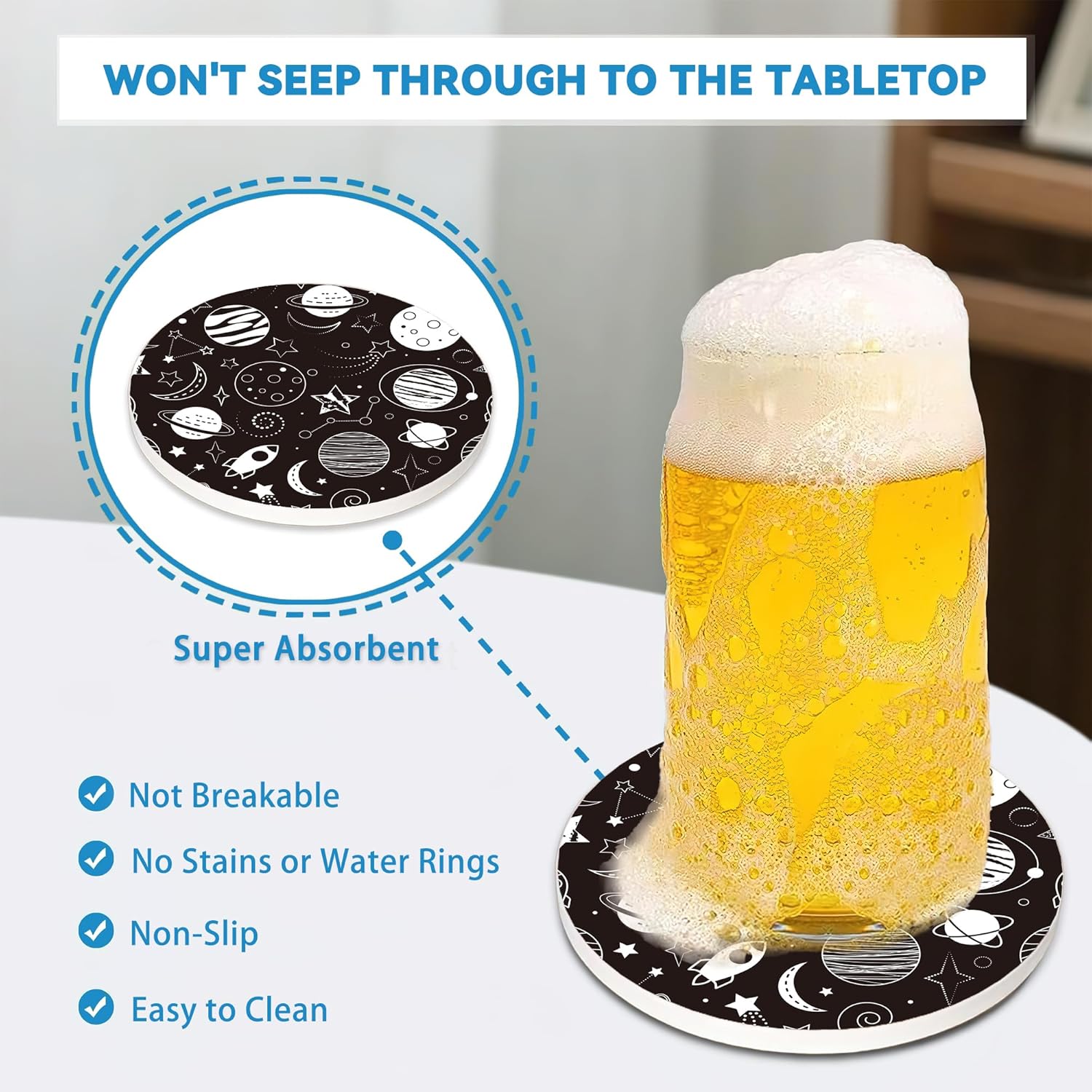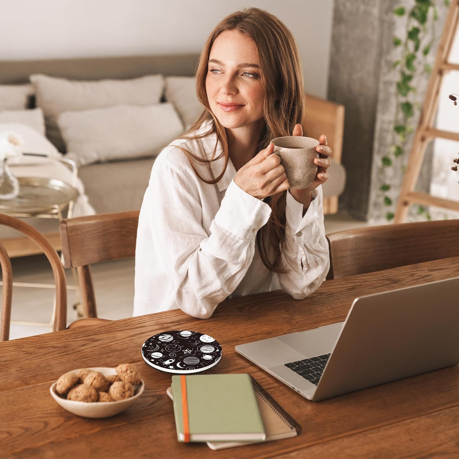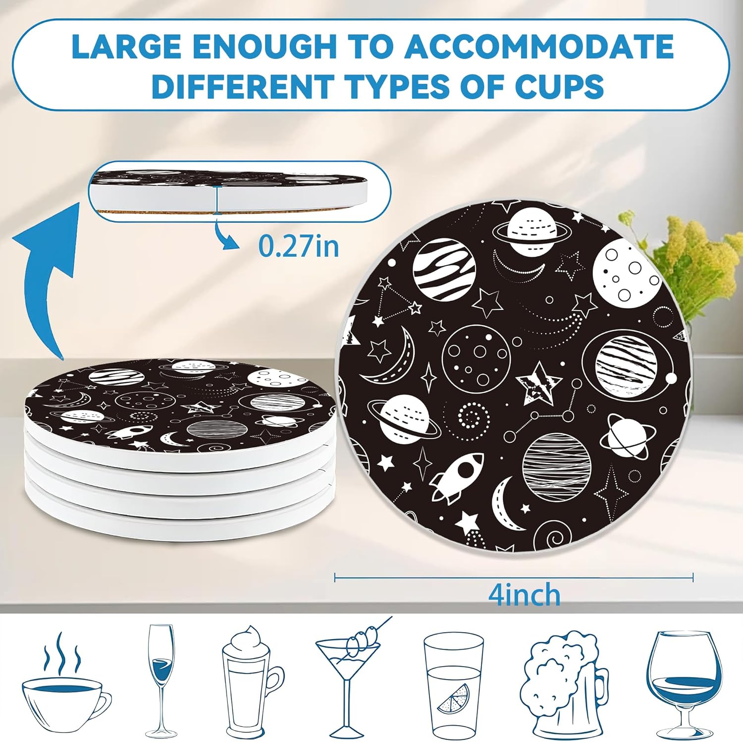 Drinks Coasters Set of 4, Cute Planets Rockets Round 4" Cup Coasters, Absorbent Ceramic Stone Coasters with Cork Base, Cute Coasters for Table Home Décor, Ideal Gifts for Women Men