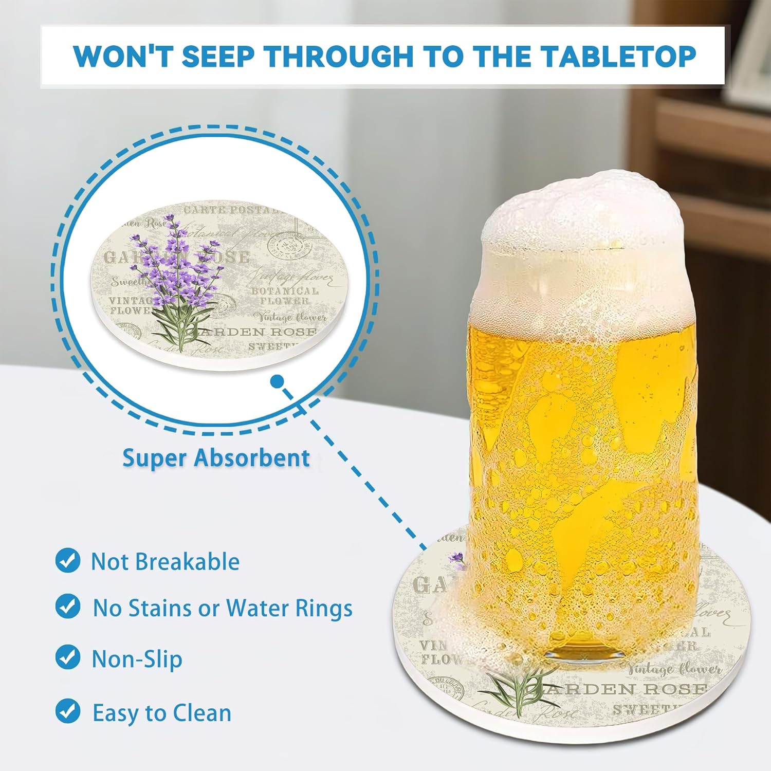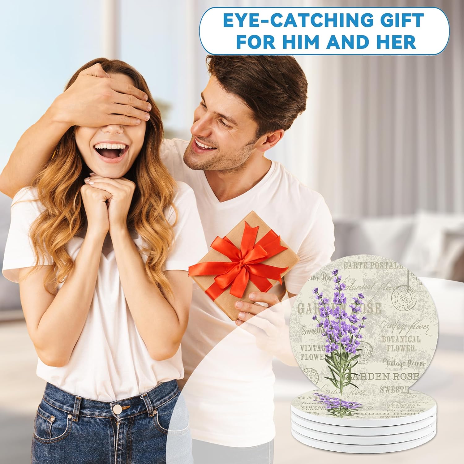 Vintage Lavender Flowers Round 4" Cup Coasters Set of 4, Absorbent Ceramic Stone Coasters with Cork Base, Ideal Home Decor Gifts for Women Men