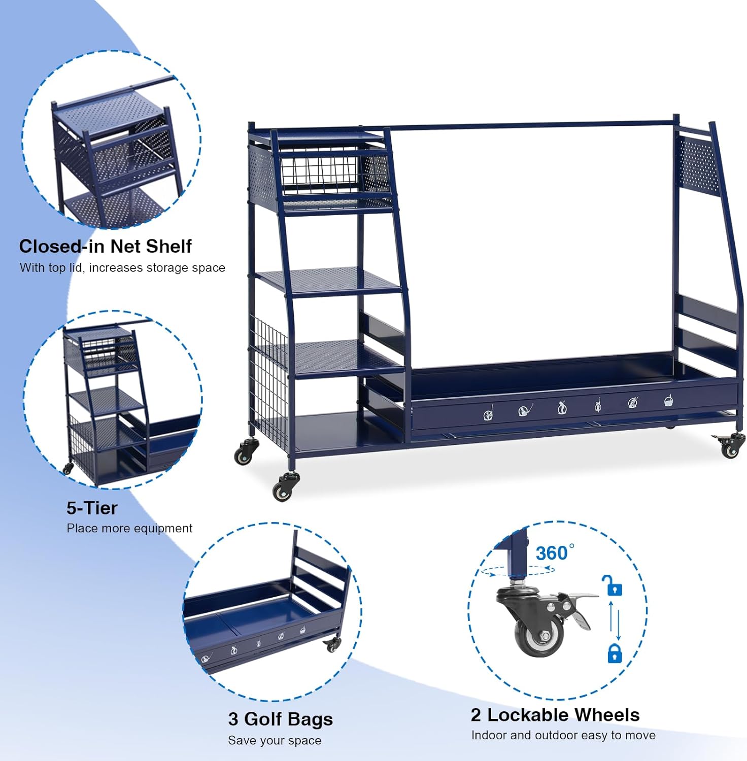 - Large Storage Space: Ideal for golf equipment storage solutions, this golf organizer has 3 main storage parts: the right main single-layer storage part holds 3 golf bags or 2 extra large size golf travel bag; on the top left is 1 closed-in net shelf basket with lid for golf balls and other golf equipment, and the top lid serves as an organizer for towels and other items to increase storage space. Below left are 3 medium-sized shelves for small golf items such as sneakers, hats, or gloves
