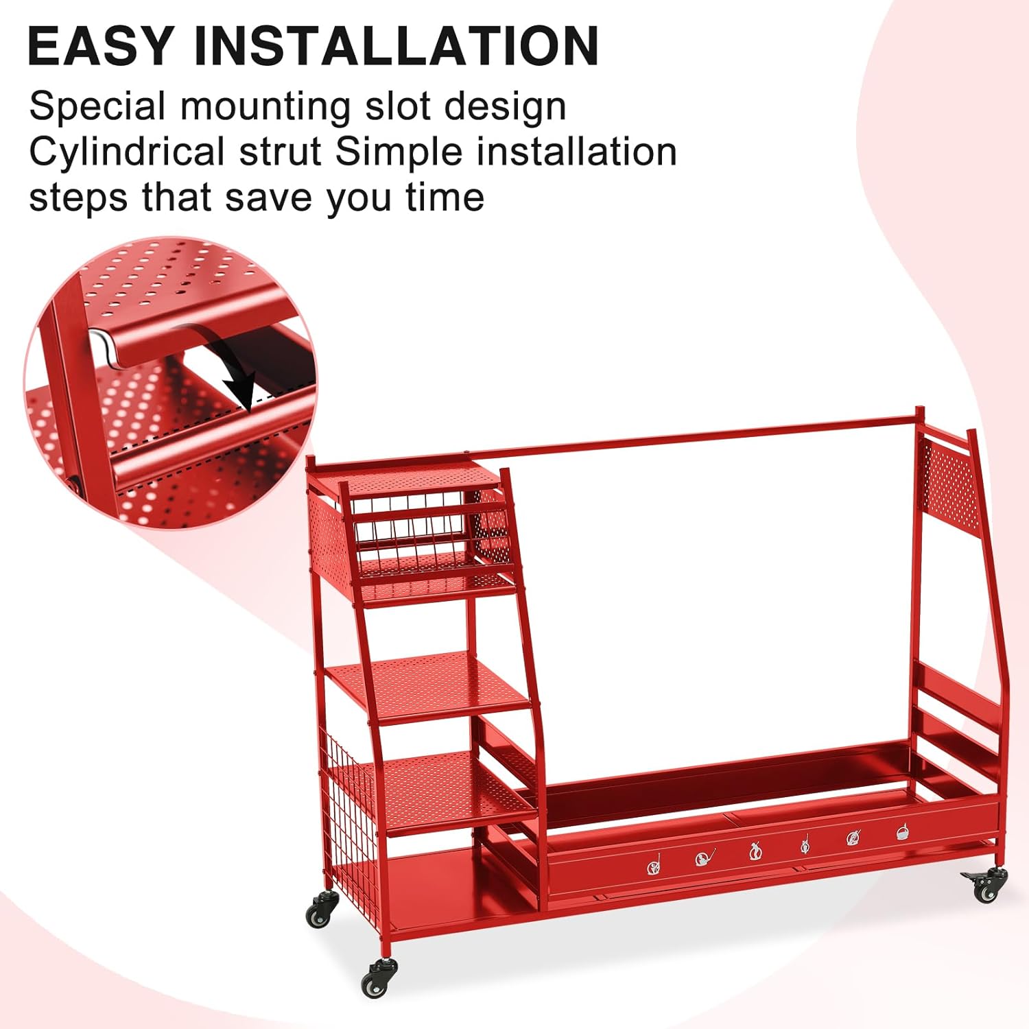 - Easy to Move & Stable When Stationary: The golf club storage stand with storage has 4 wheels that can rotate 360°, and you can push the garage storage stand to wherever you want. 2 of the 4 wheels can be locked, allowing flexible movement while maintaining sufficient stability in the placement position of the golf bag rack holder. The assembled freestanding garage storage station features 51.8'' L x 15.8'' W x 34.3'' H. Please measure where you want to put it before buying