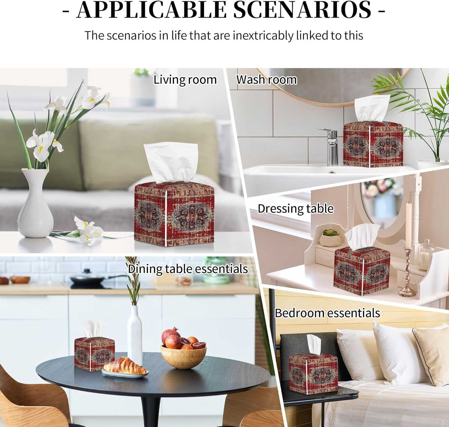 Tissue Box Cover Square, Vintage Boho Carpet Rug Leather Tissue Box Holder Decorative Organizer for Bathroom, Home Office Car Decor