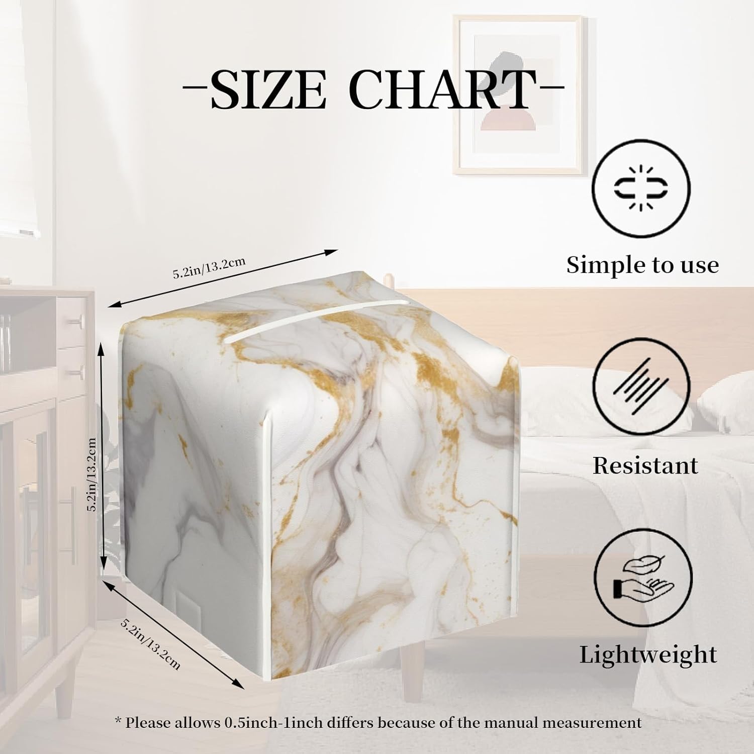 - Universal Size:Tissue box cover measures 5.2"L x 5.2"W x 5.2"H,Accommodates most standard square paper towels on the market