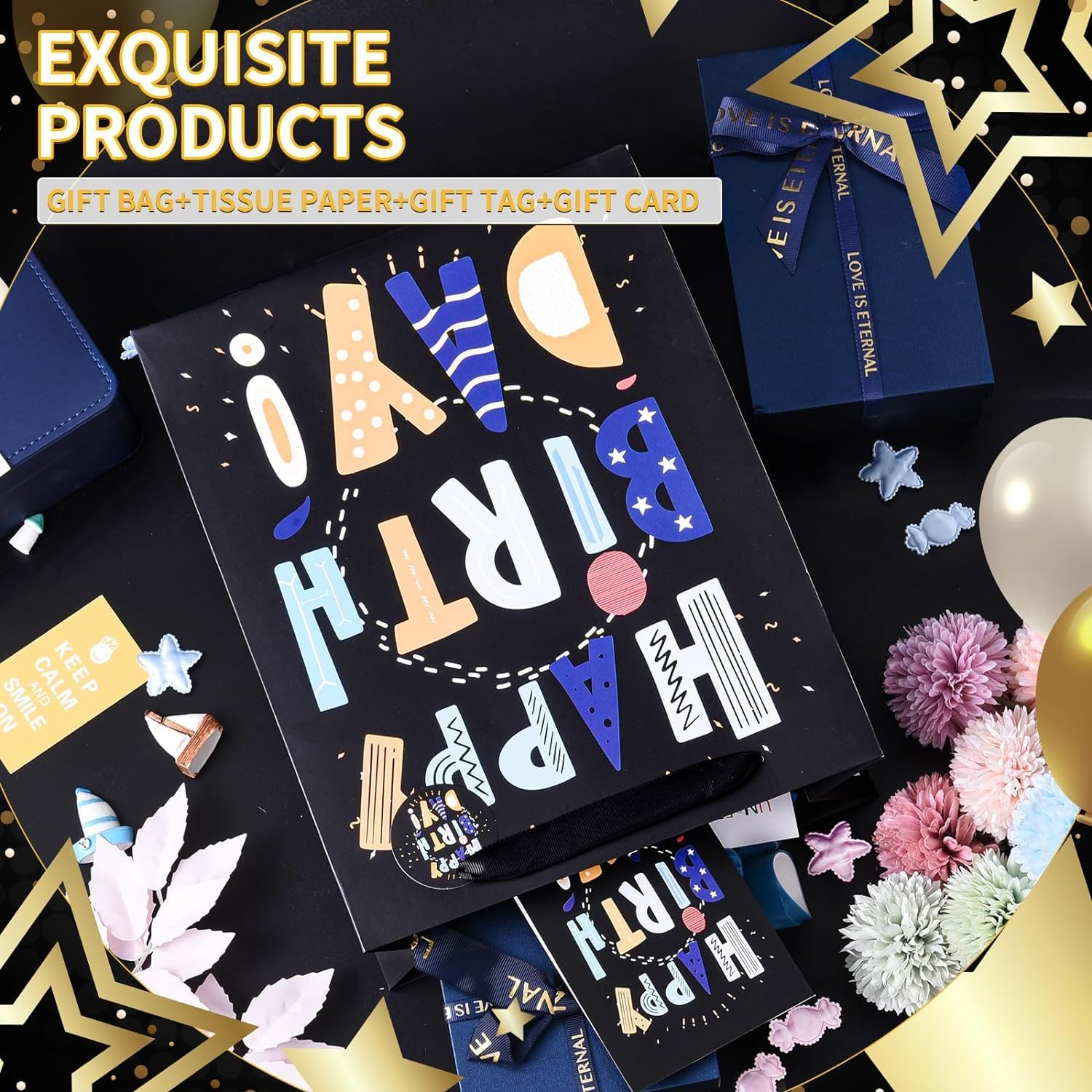 13" Black Happy Birthday Bags for Kids with Tissue Paper and Greeting Card for Party,Happy Birthday Gift Bag for Kids, Boys, Girls, Baby Boy,Men Women,Gift Bags Medium size (1 Pcs Black, Kids Gift Bag)
