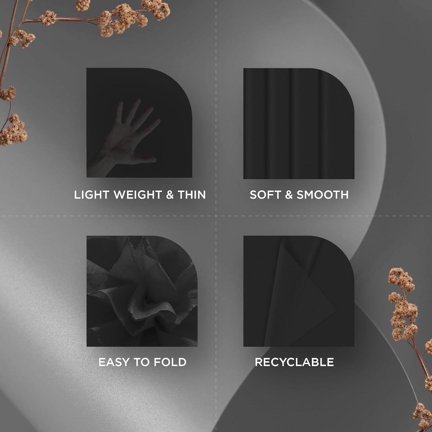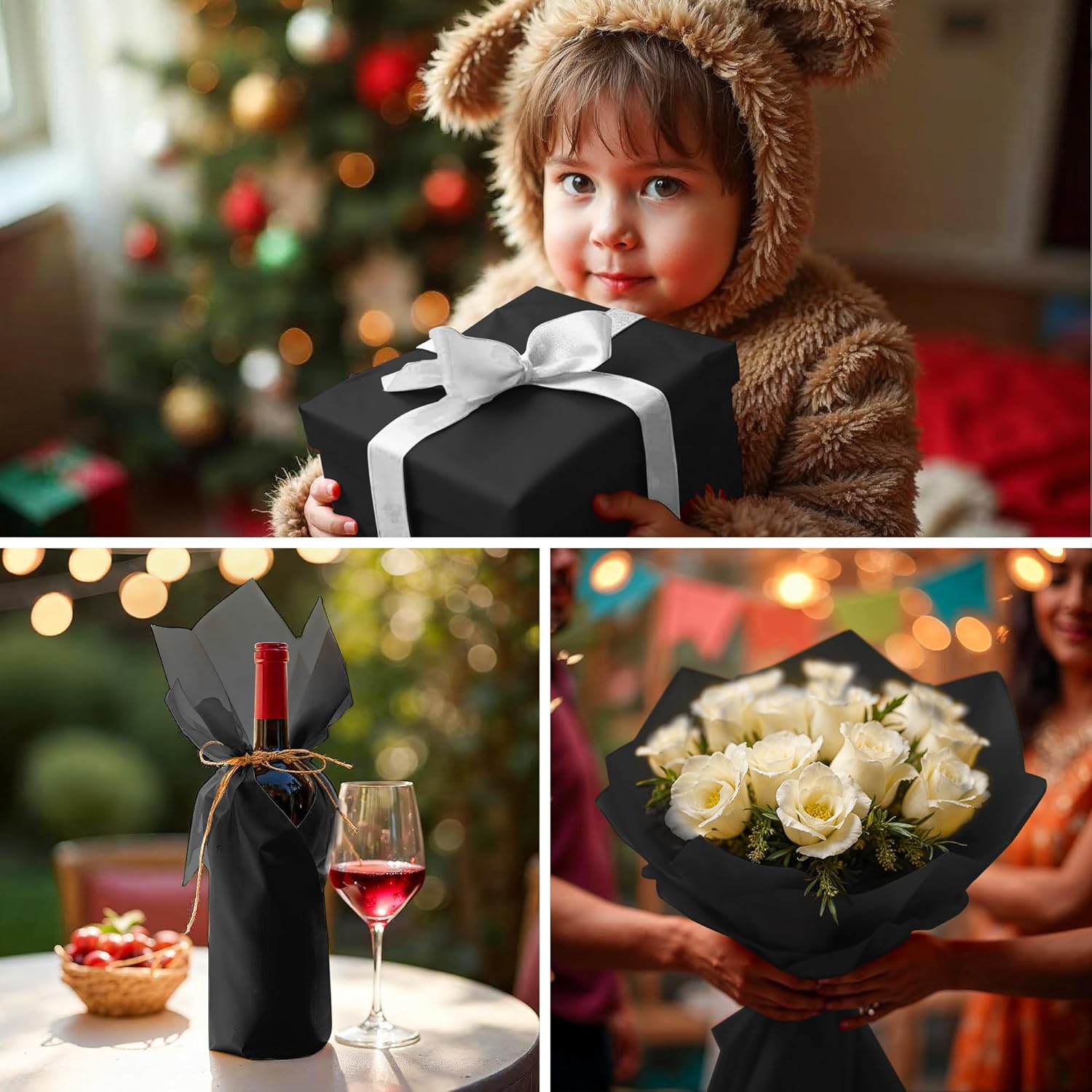 - 🎨【ELEGANT BLACK COLOR】Rich black tissue paper sheets add sophistication to your Christmas gift wrapping and crafting projects. Ideal black gift tissue paper creates a timeless aesthetic for holidays, parties or professional branding. For minimalist or modern themes, black Christmas tissue paper complements gold, white, or red wrapping accents beautifully.