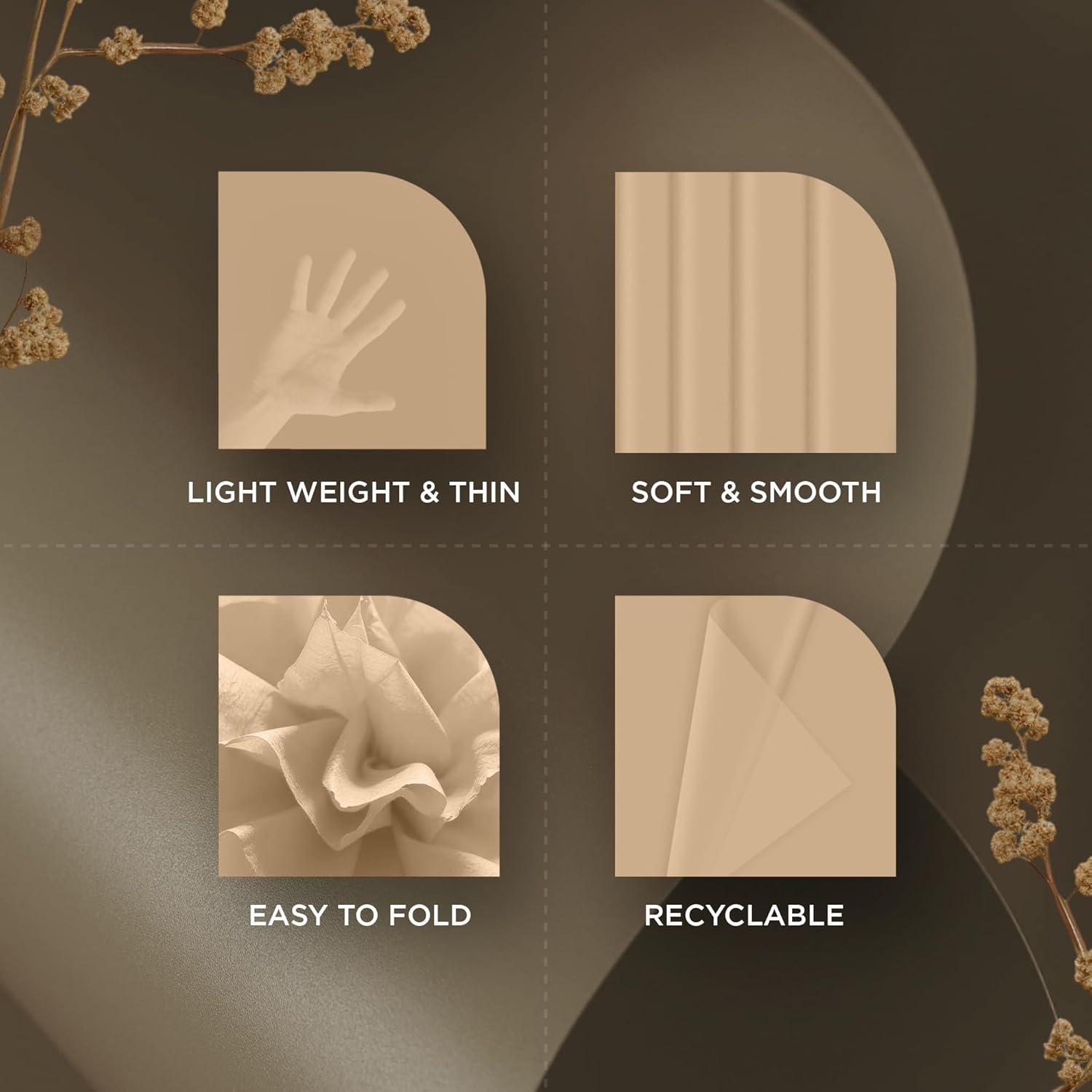 - 🎨【ELEGANT KRAFT COLOR】Rich light brown tissue paper sheets adds a touch of sophistication to your gift wrapping and crafting projects. Ideal brown gift tissue paper creates a timeless aesthetic for holidays, parties or professional branding.
