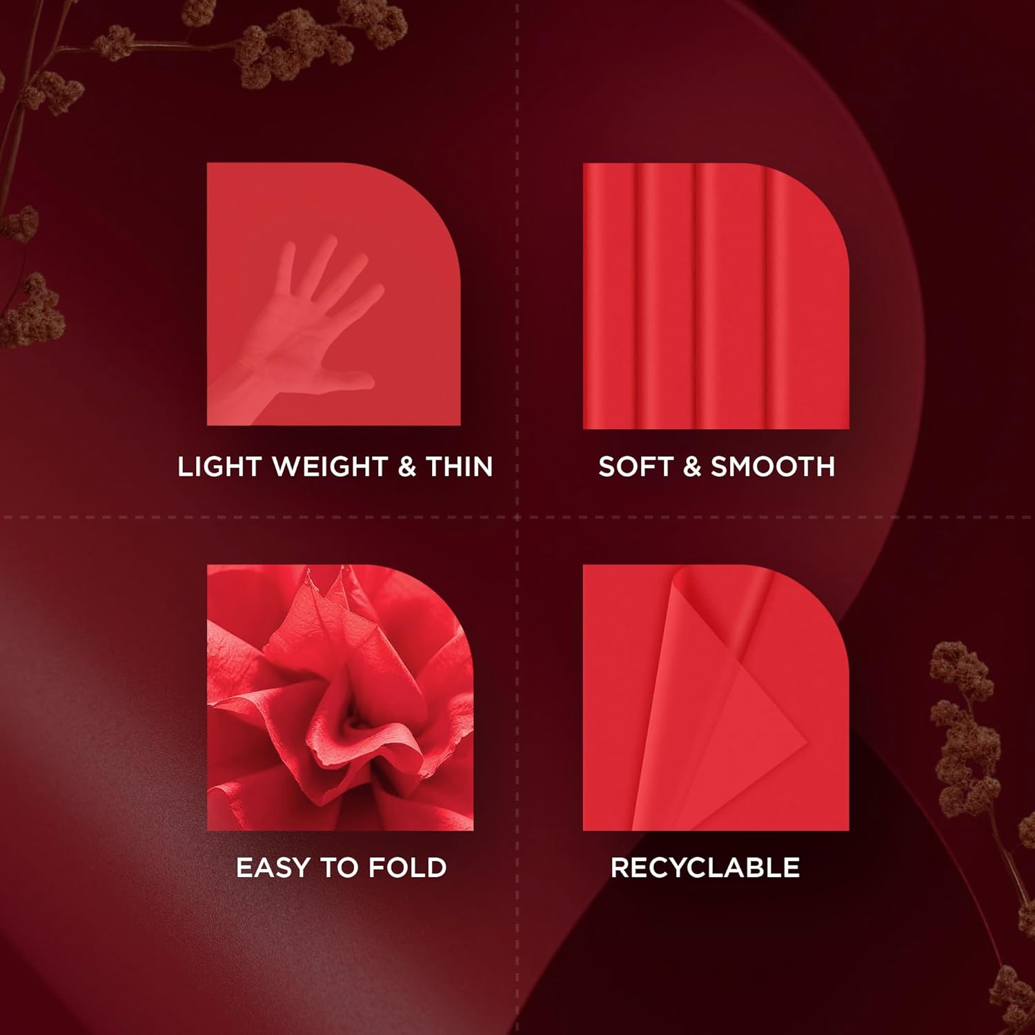 - ♻️【ECO-FRIENDLY & RECYCLABLE】Made from sustainable materials, these red wrapping tissue paper sheets are recyclable and eco-friendly. Red Christmas wrapping paper is ideal for eco-conscious Christmas gift wrapping and stylish packaging.