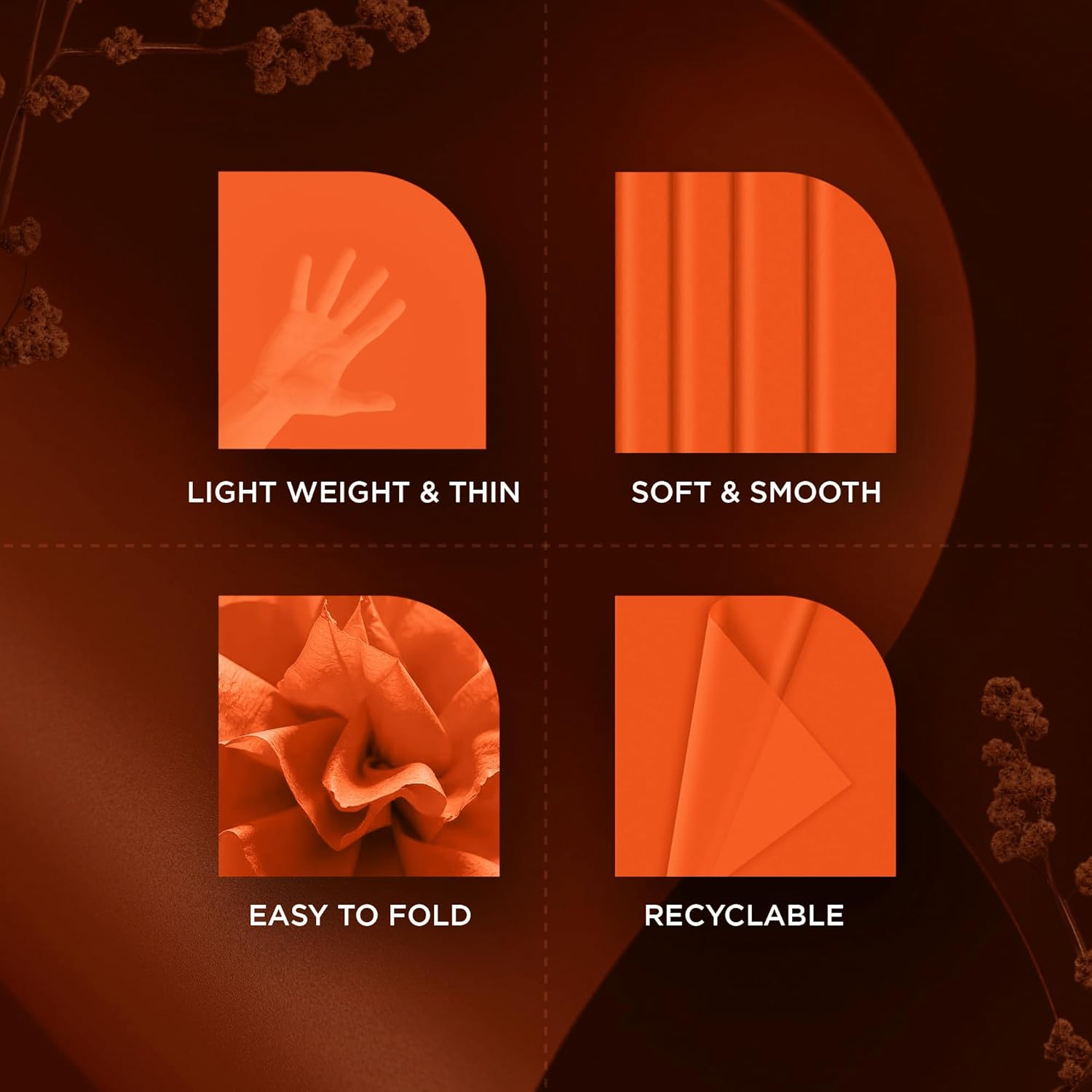 - 🎨【ELEGANT ORANGE COLOR】Rich orange tissue paper sheets adds a touch of sophistication to your Christmas gift wrapping & crafting projects. Ideal orange gift tissue paper for gift bags creates a timeless aesthetic for holidays, parties or professional branding orange gift bags. Burnt orange tissue paper bulk For minimalist or modern themes. Orange Christmas tissue paper complements gold, black, white, kraft or green wrapping accents beautifully.