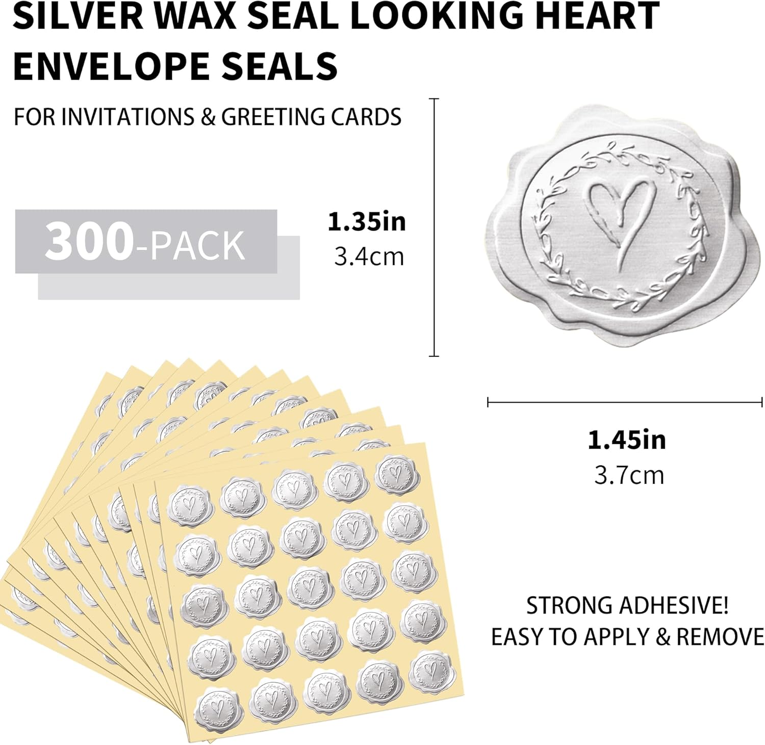 300pcs Silver Embossed Wax Seal Looking Heart Envelope Seals for Wedding Invitations/Greeting Cards/Party Favors, Self-Adhesive
