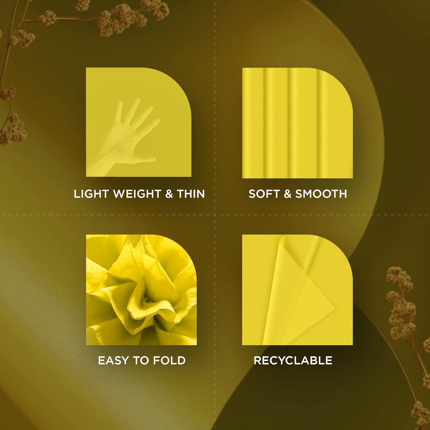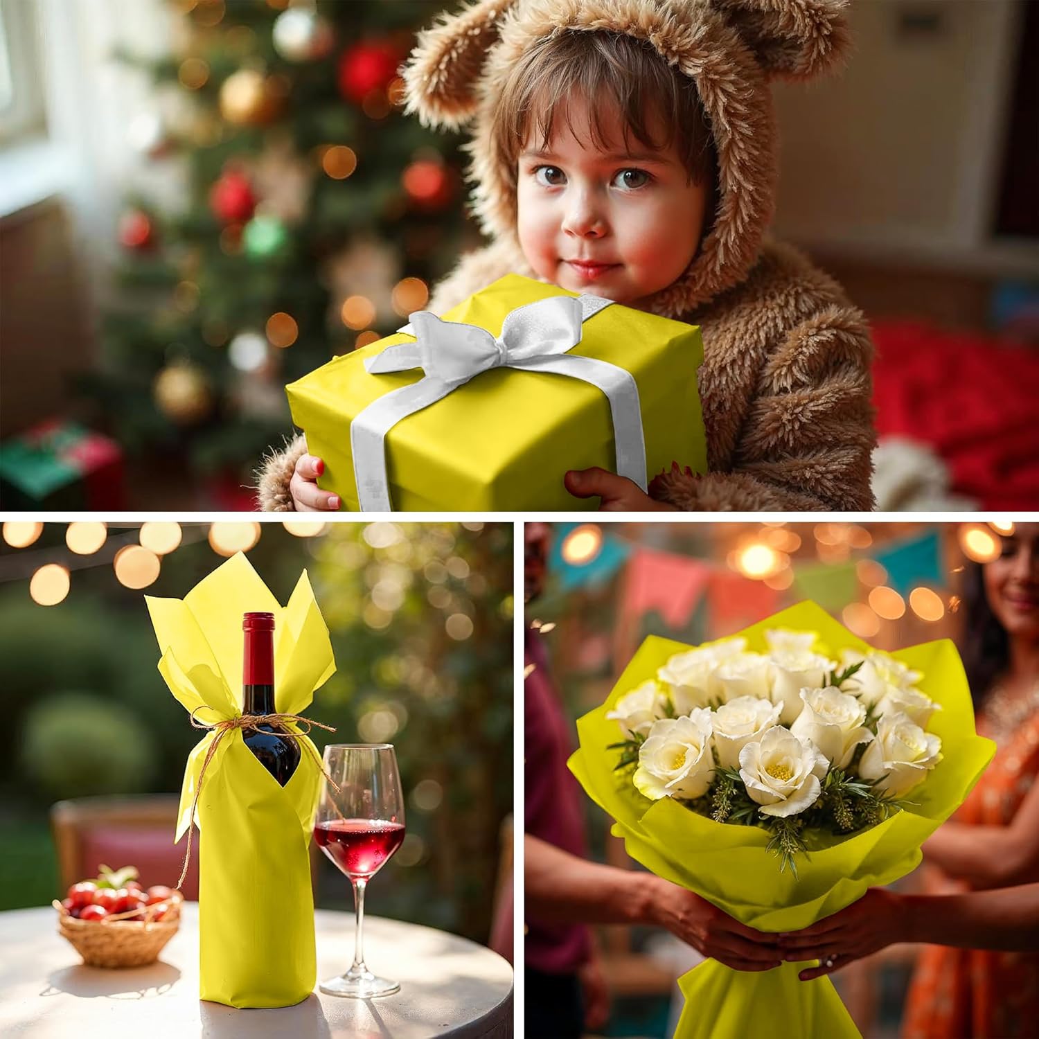- 🎨【ELEGANT YELLOW COLOR】Rich yellow tissue paper sheets adds a touch of sophistication to your Christmas gift wrapping & crafting projects. Ideal yellow gift tissue paper for gift bags creates a timeless aesthetic for holidays, parties or professional branding. For minimalist or modern themes, yellow Christmas tissue paper complements green, white, gold, blue, black wrapping accents beautifully.
