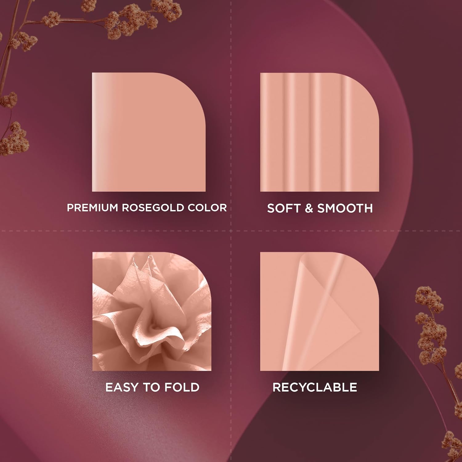 - 🎨【PREMIUM ROSE GOLD COLOR】Rich rose gold wrapping paper adds a touch of sophistication to your Christmas gift wrapping & crafting projects. Ideal rose gold gift tissue paper sheets creates timeless aesthetic for holidays, parties or professional branding. Metallic rose gold gift wrap for minimalist or modern themes. Rose gold Christmas tissue paper complements pink, white, kraft or green wrapping accents beautifully.