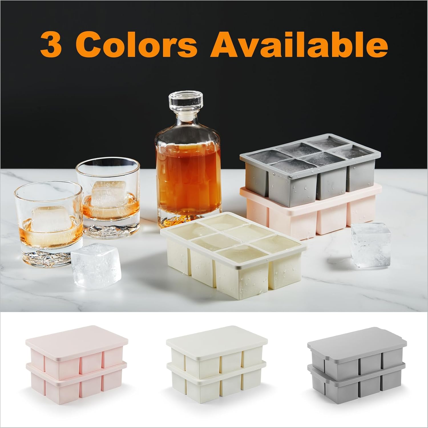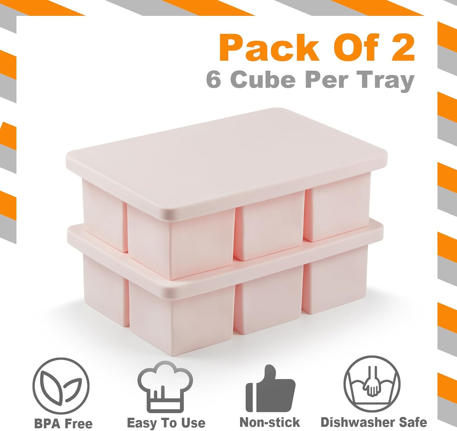 - 2 Pack Large Ice Cube Tray With Lid: Comes with set of 2, 6 giant ice cubes per ice mold, 2 inch large per ice cube and shapes square; Perfect to chill cocktails, whiskey, tequila, vodka or other drinks with less dilution. You can also use these ice molds to freeze food in perfect portions, such as soup broth or sauce servings, recipes, meal prep, and portion controlled meals