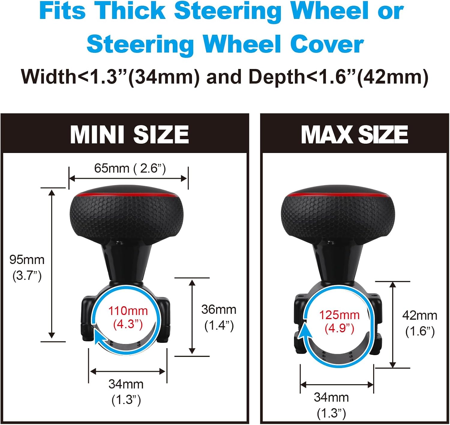- ✅【Large Knob】Large steering wheel knob with bigger mount than other knobs, it fits most vehicles; Fits steering wheel Diameter 1.3" - 1.6"; Please use the supplied rubber pad to protect the steering wheel and adjust the size. (Tip: the rubber pad can be cut and used)