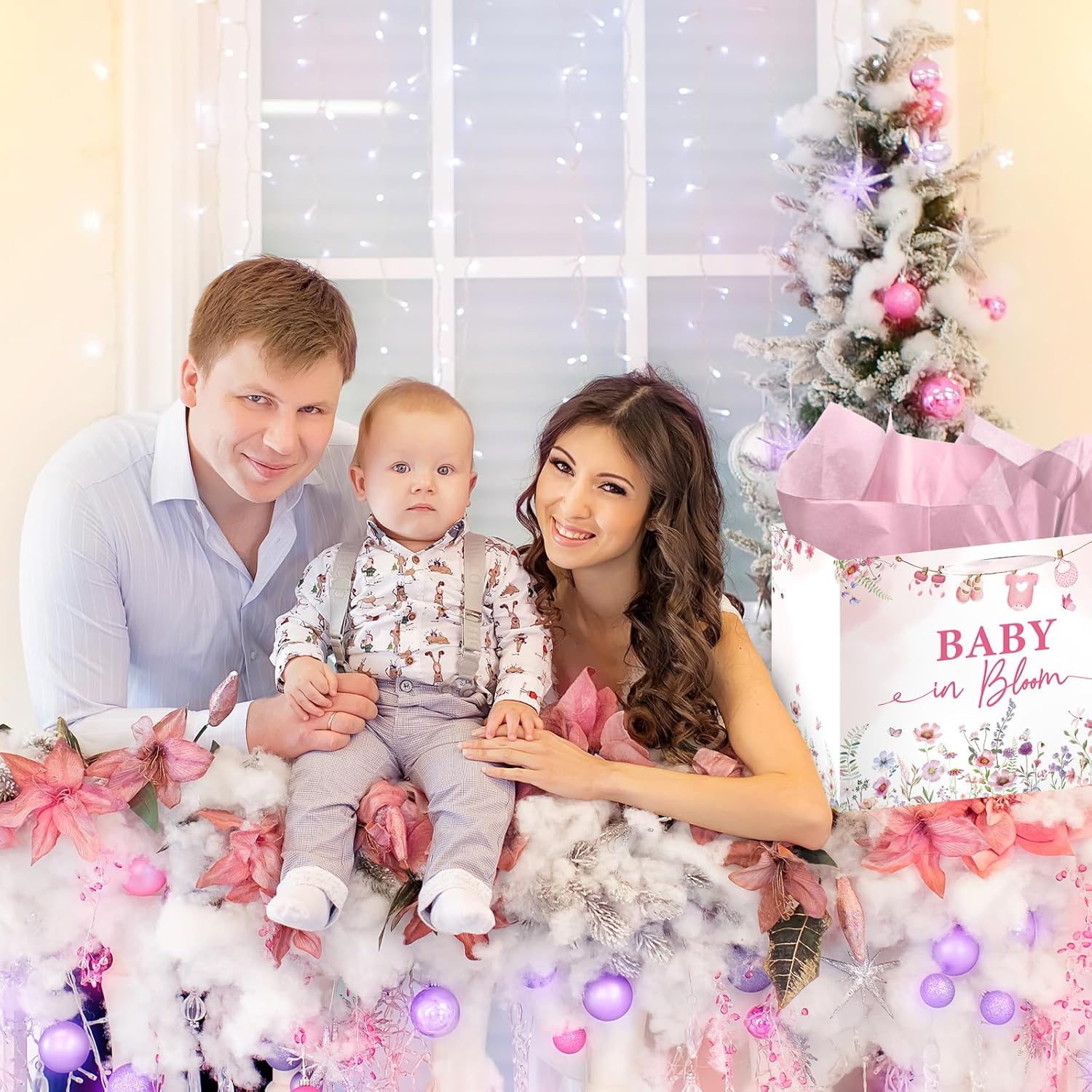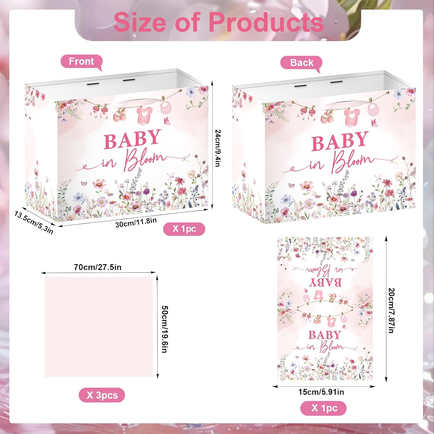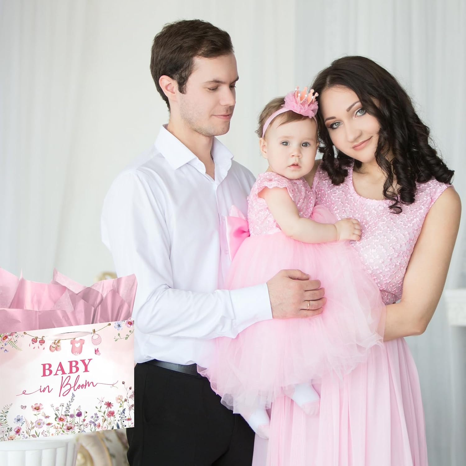 - Baby in Bloom Gift Bag: You will get 1 x baby in bloom gift bag, 1 x greeting card, 3 x pink tissue paper; The gift bag is beautifully printed and can make gender reveal party more atmosphere