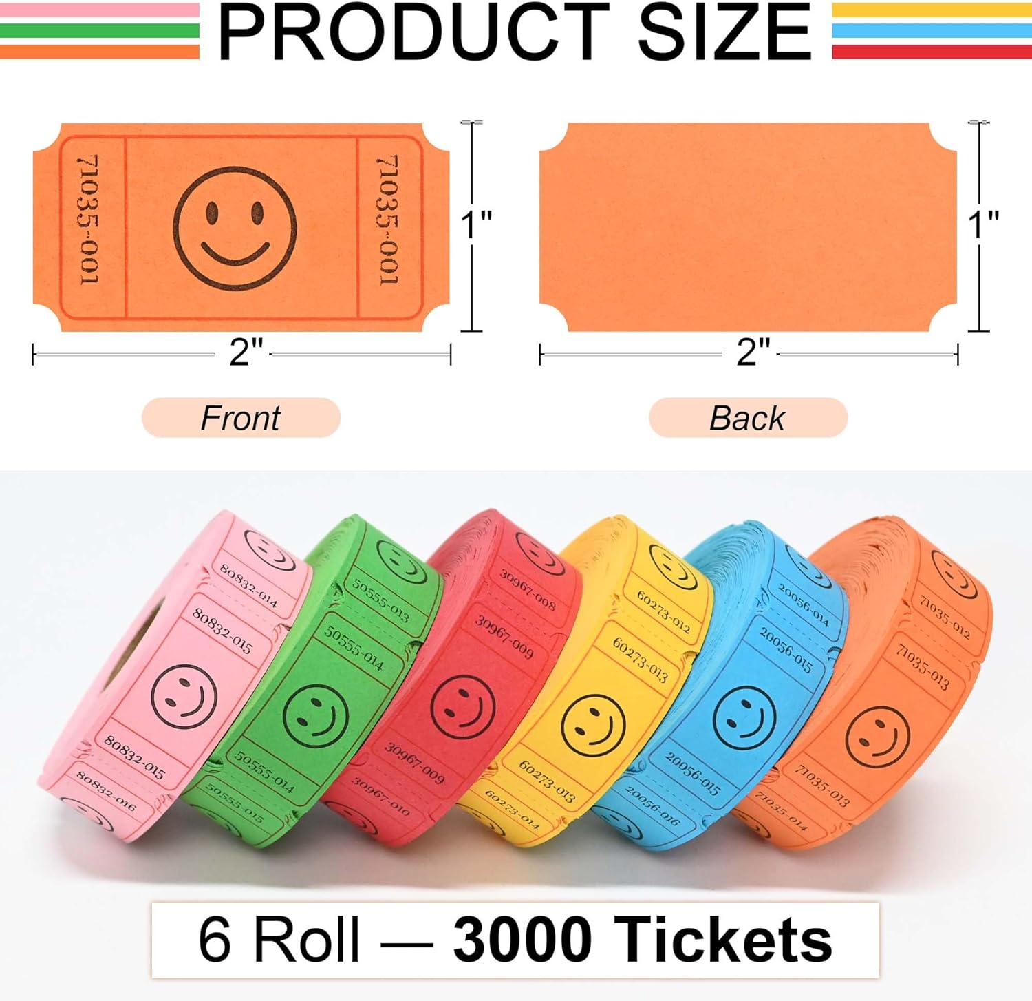 - Value Pack: 1”x2” raffle tickets, 6 rolls in red, orange, green, yellow, blue and pink each. Each roll contains 500 tickets, 3000 tickets in total.