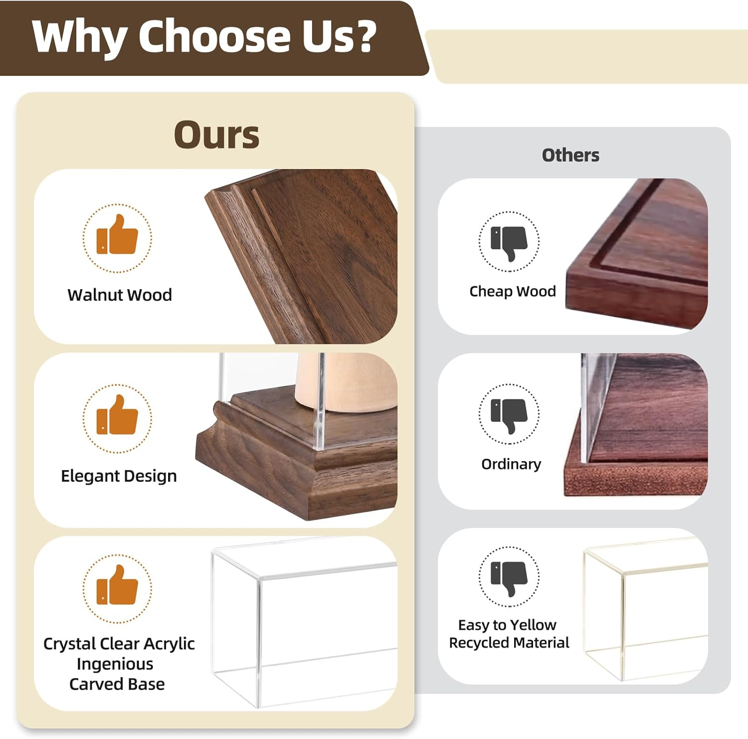- Natural Walnut Wood Base + Crystal Clear Acrylic + Stable Wood Stand