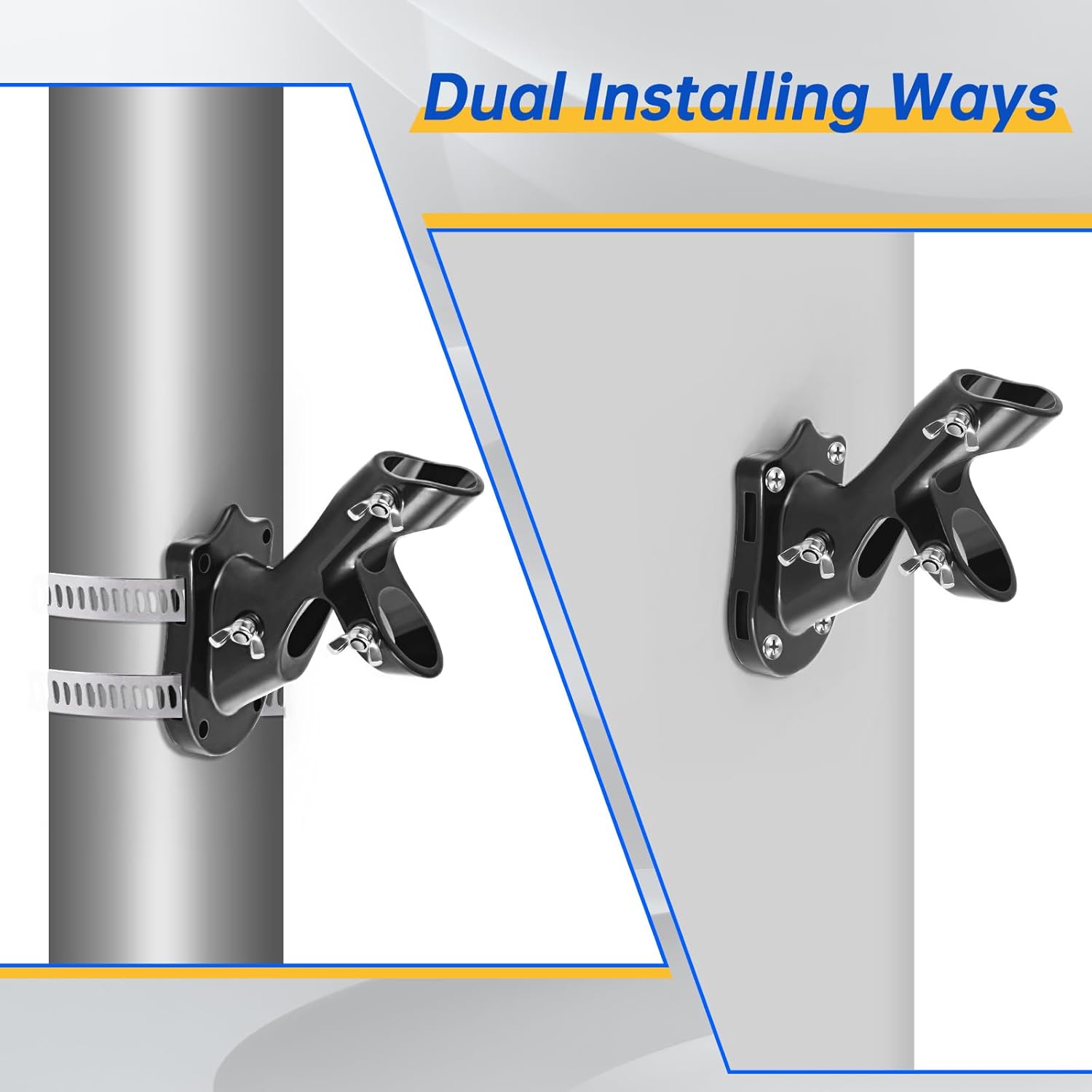 - Rock-solid Flag Pole Mount: The heavy-duty aluminum mount is incredibly sturdy and durable, providing excellent support. Two-positions (45° or 90°) hole choices allow you switch the angle of the flagpole to display flags, banners, or other hangable items, both indoors and outdoors. Slit openings design allow you mount holder on columns without drilling holes ; or Mounting on concrete or wall with sturdy standard screws, and anchors