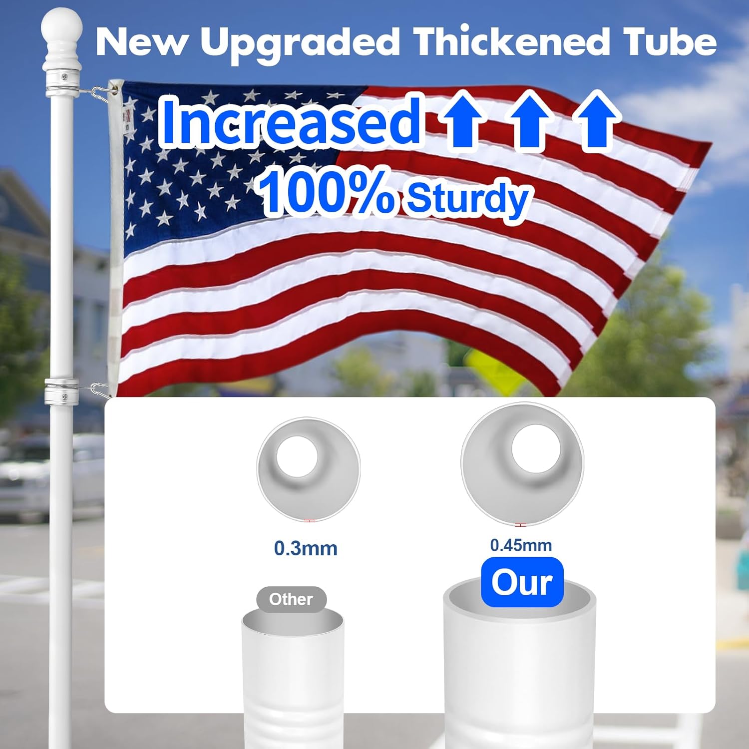- 6 FT Upgraded Thicken Flag Pole Kit: Our Flag pole is made of high quality stainless steel, and features a durable 0.45mm upgraded thicken construction, designed for superior stability and enduring performance against the elements.
