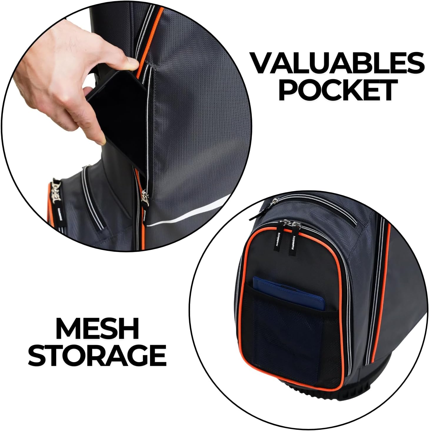 - Premium Features: Our cart golf bag includes 6 total pockets, including a valuables pocket, single carry strap, umbrella holder, glove holder, towel clip, and rain hood