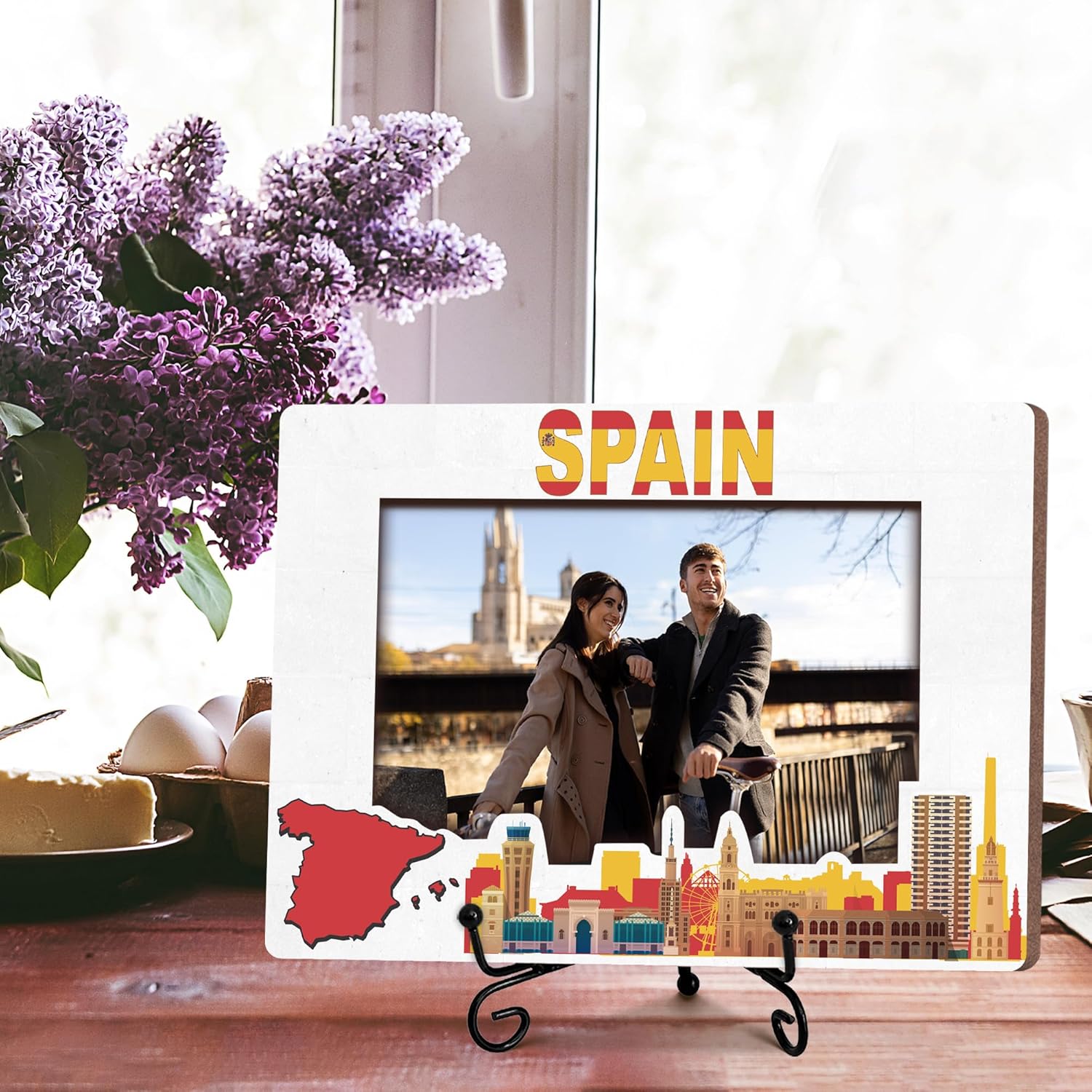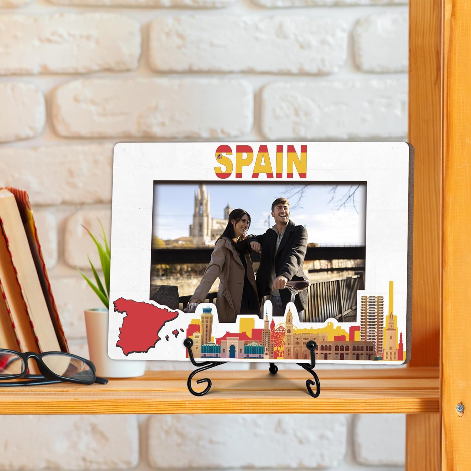 Spain Travel Picture Frame, 5 x 8 Spain Themed Wooden Photo Frame with Stand, Vacation Anniversary Honeymoon Gifts For Friend Family Couples, Home Office Desk Decorations-A08