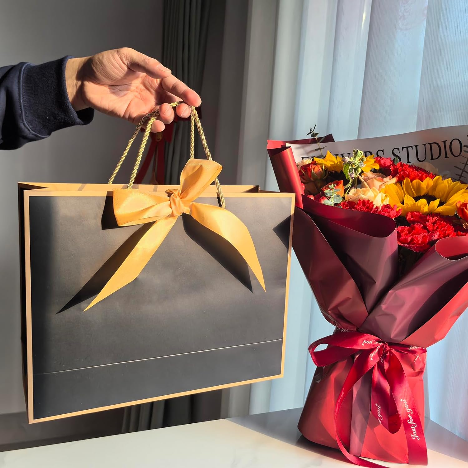 - ăPackage IncludesăYou will receive 12pcs of paper gift bags with handles and paired with gold ribbon for you to tie a beautiful bow. There is no text on the gift bag, you can write your blessing on the bag to express your feelings.