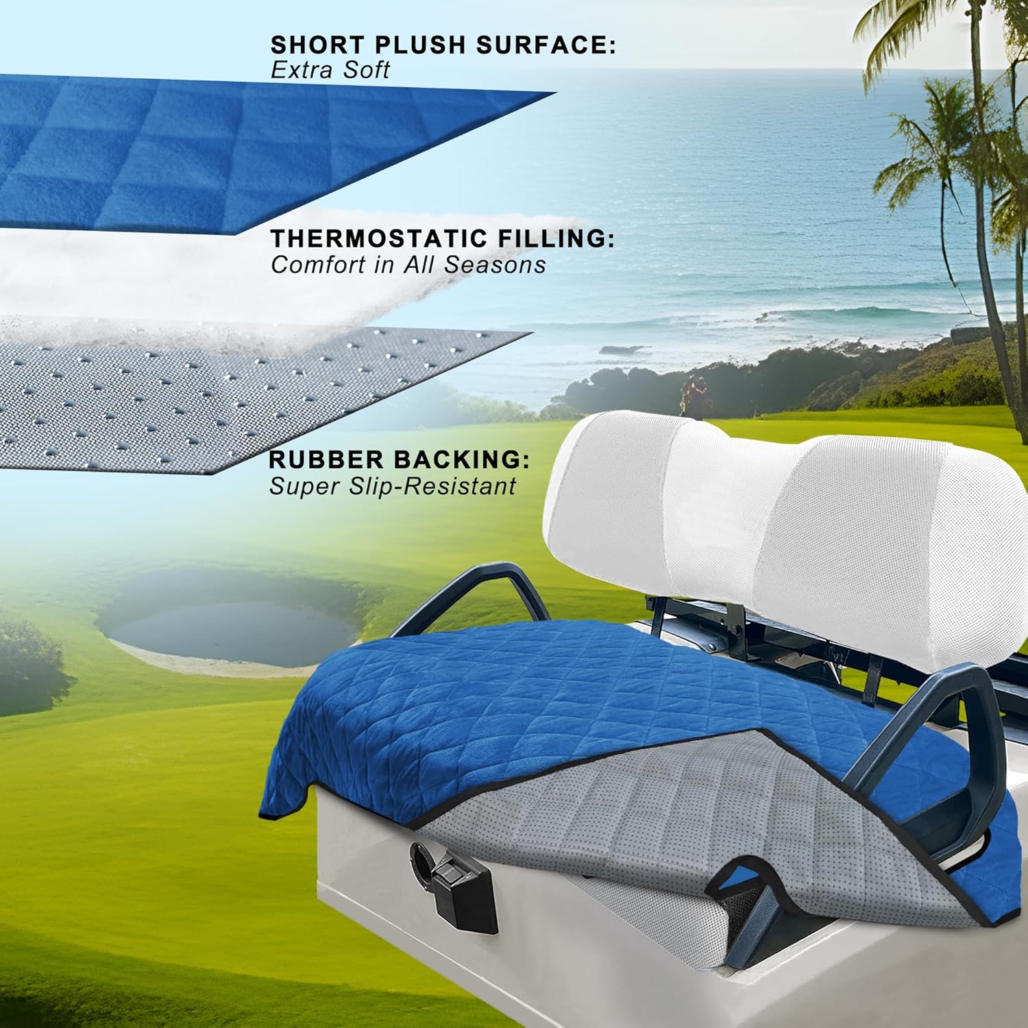 - ăHigh-quality MaterialăOur golf cart seat blanket combines a soft, short-plush surface with a thermally insulating fibre layer and a non-slip dotted back, ensuring comfort and a secure fit.