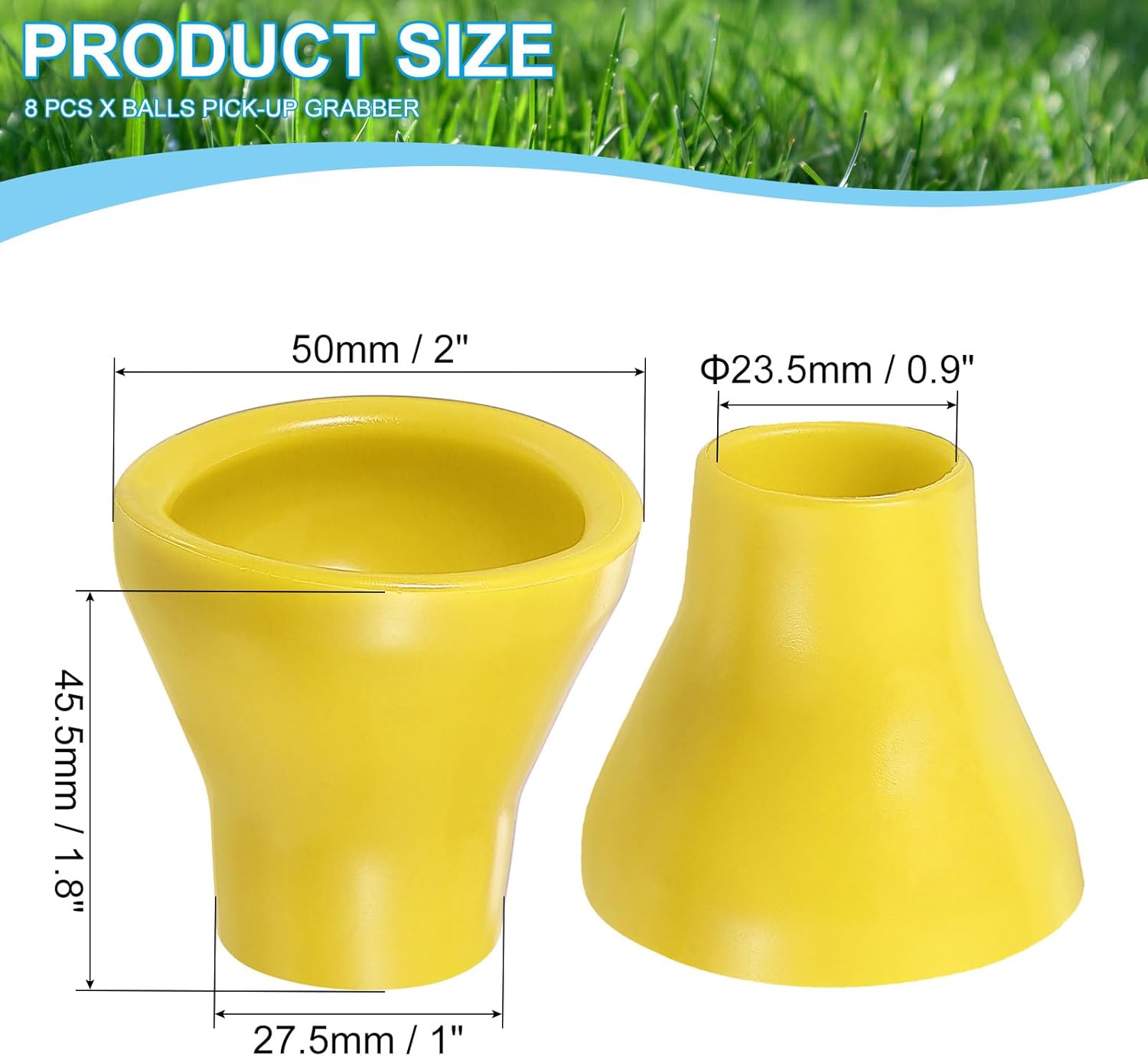 - Color: Yellow; Size: 50 x 27.5 x 45.5 mm / 2 x 1 x 1.8 Inch (Upper Width * Lower Width * H); Inner Diameter: 23.5 mm / 0.9 Inch; Packing List: 8 Pcs x Balls Pick-up Grabber