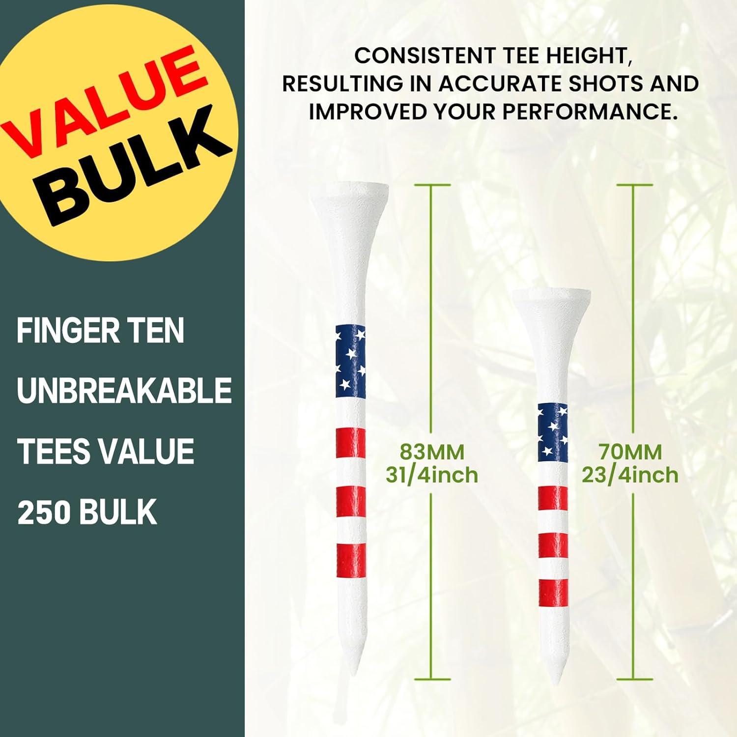 FINGER TEN Bamboo Golf Tees Wood 1 1/2 2 3/4 3 1/4 Inch Wooden Short Long Tee Color Bulk 250/500/1000/2000 Count for Men Women Kids in Red Pink USA Flag