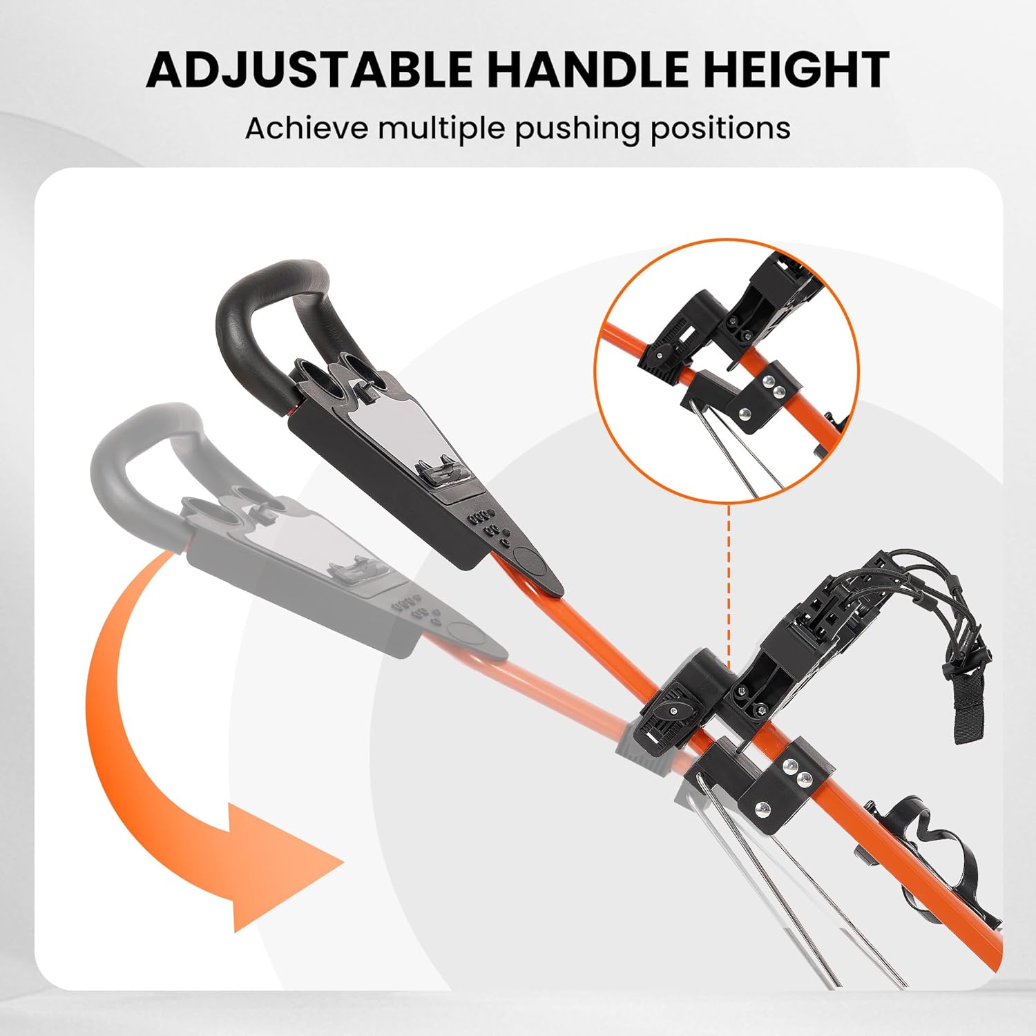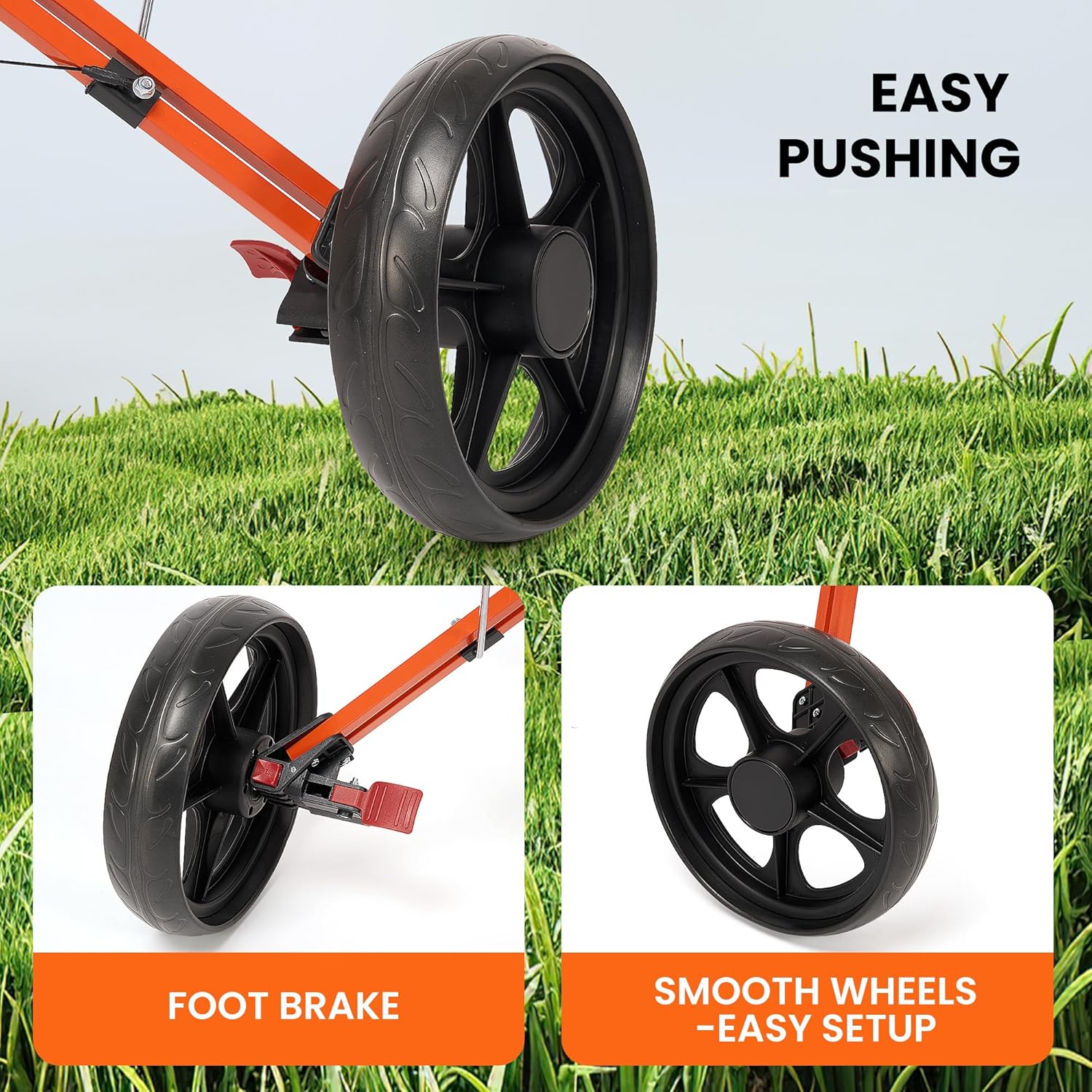 - Bright Color Choice: Add a touch of style to your golf game with our golf cart, available in a vibrant orange color that stands out on the course. This lively hue not only gives the cart a fresh, energetic look but also makes it easy to spot from a distance, so you can quickly locate your gear. The bold design of the golf push cart is sure to complement your personal style while offering all the functionality you need