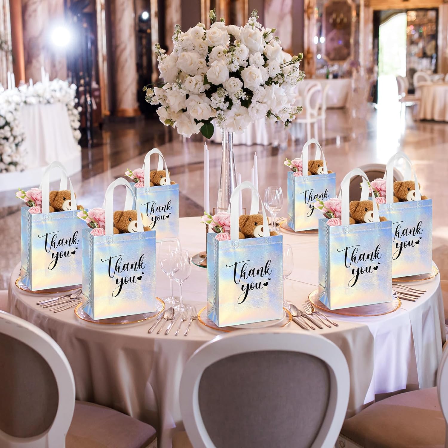 - Applicable for Parties and Daily Life: these thank you tote non woven bags are ideal for weddings and bridal showers, also suitable for birthday parties, baby showers, Thanksgiving, graduation ceremonies, afternoon tea parties, business banquets and other occasions; There is a large enough capacity to hold gifts, jewelry, lipstick, souvenirs, toys, clothes, snacks, candy and more, providing you and your guests with a wonderful party atmosphere