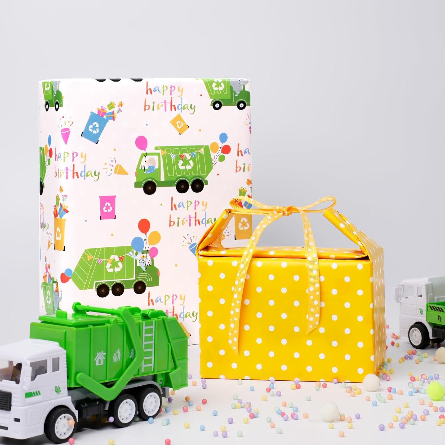 - Reversible Design: This double-sided wrapping paper features a fun garbage truck design with trash bins, birthday balloons, and "Happy Birthday" text on one side. The reverse side showcases a cheerful yellow background with white polka dots, adding excitement and style to any celebration.