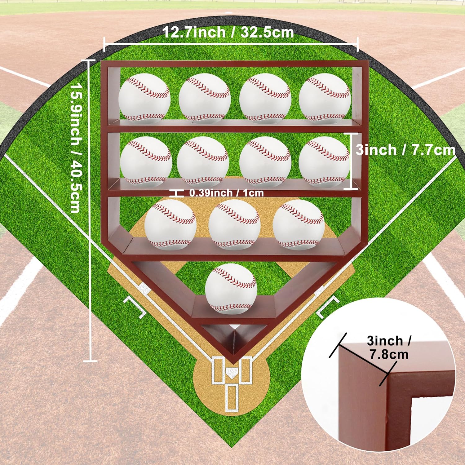 - Dimensions: Hodeframe Baseball display case cabinet: 12.8"H X 16"W X 3.1"D (exterior). Distance between rows: 2.95".Thickness of the shelf: 0.35". This will only hold baseballs. This will not hold Softballs.