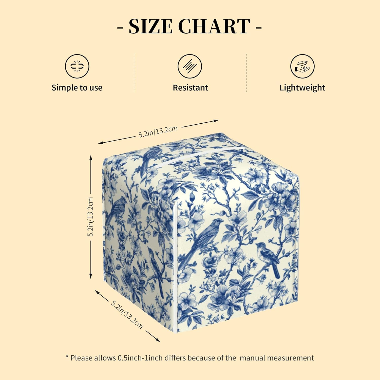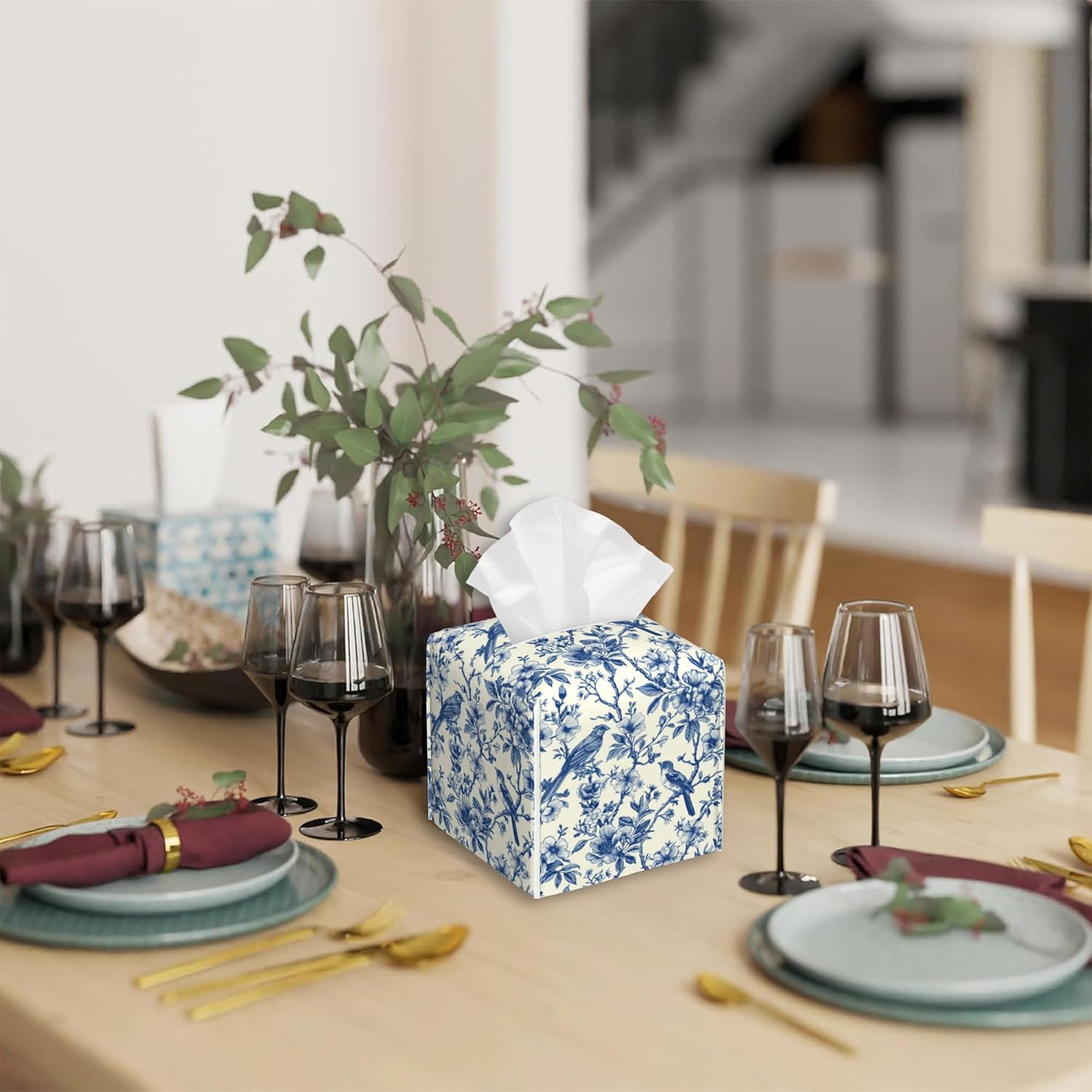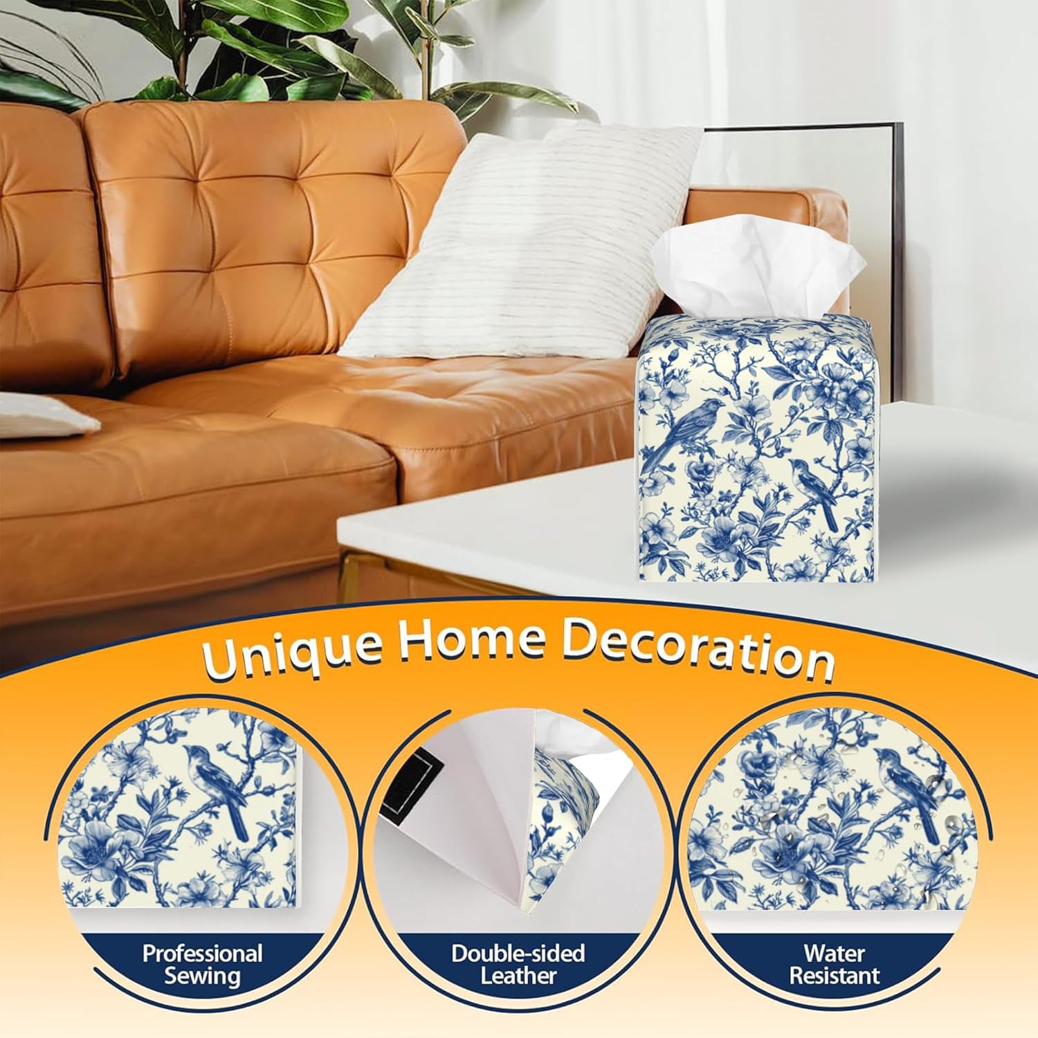 Tissue Box Cover Square,Vintage Floral and Blue Bird Tissue Box Holder Waterproof Leather Facial Paper Case Modern Home Decoration for Bedroom Dresser Night Stand Office Desk