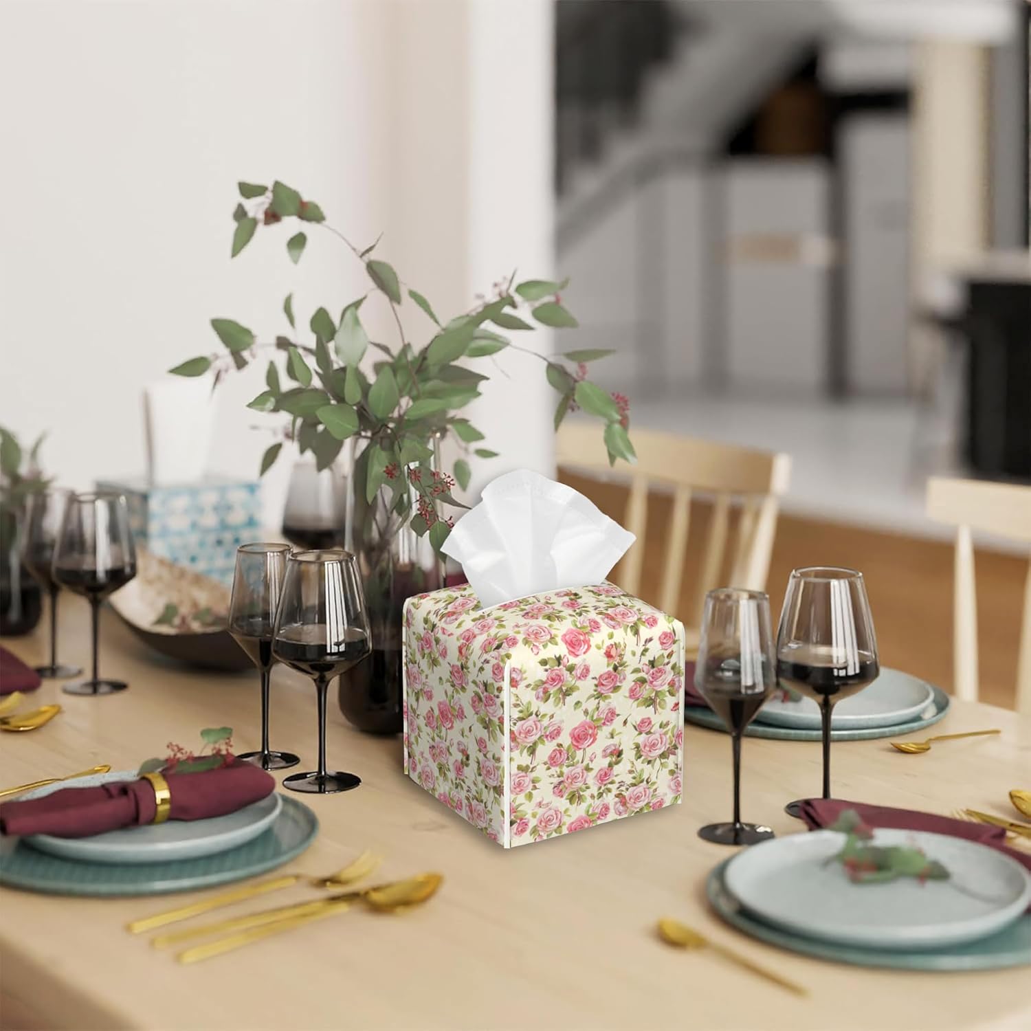 Tissue Box Cover Square,Watercolor Pink Roses Tissue Box Holder Waterproof Leather Facial Paper Case Modern Home Decoration for Bedroom Dresser Night Stand Office Desk