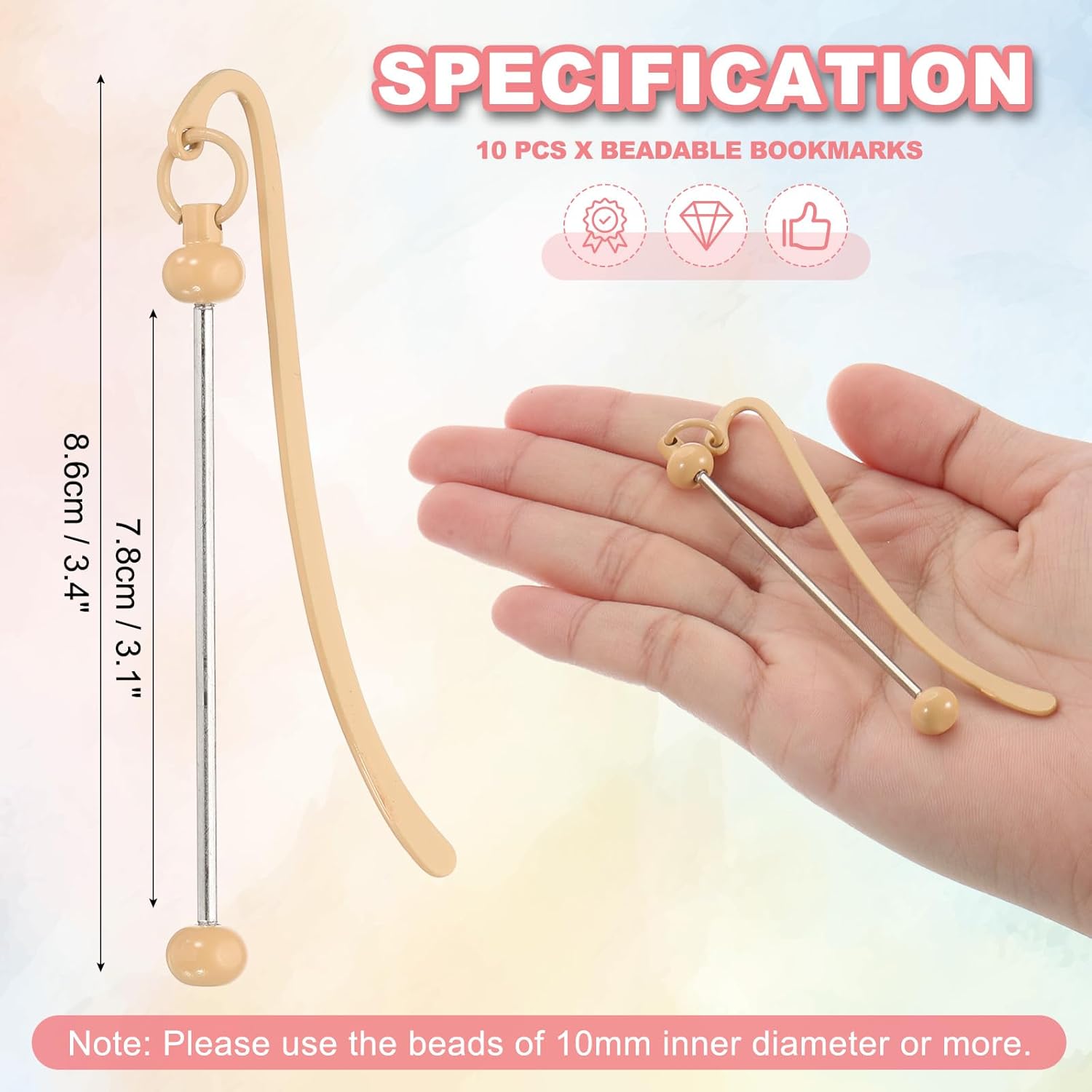 - Specification: Material: Metal; Color: Khaki Color; Overall Length: 8.6cm/ 3.4 inch; Beadable Bar Length: 7.8cm/ 3.1 inch; Applicable Inner Diameter of Beads: 10 mm or More; Package List: 10 Pcs x Beadable Bookmarks