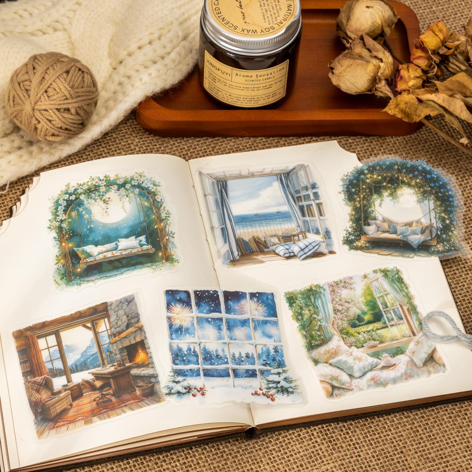 - Charming Window-Themed Designs: Immerse yourself in scenic charm with our window scenery PET sticker set. Featuring 60 stickers in 6 unique theme styles, these designs bring cozy and inspiring vibes to your journals, scrapbooks, and creative projects
